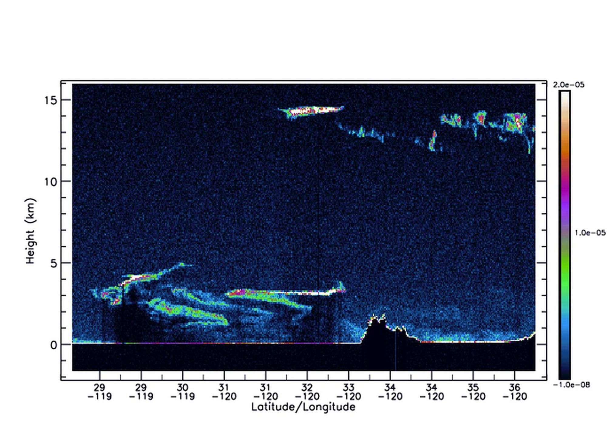 The colors of the features in the air in this image represent how much laser light a given feature reflects back to space. This measure, called “backscatter coefficient,” directly relates to the density of smoke and clouds. The thickness of the smoke plumes increase as the colors graduate from blue (low values), to green (intermediate values), to orange, and finally to white (very high values). Note the “shadows” under the thickest portions of the smoke plumes.