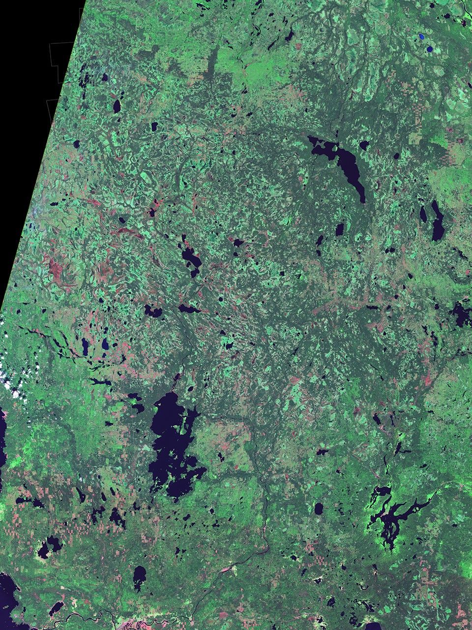 This false-color Landsat image shows the southern two thirds of the park. The long north-south extent and overall large size makes it impossible to gather the entire park from a single Landsat satellite pass. The entire park takes in 500,000 hectares (1.2 million acres) of land and lake. The most obvious feature in this image is the deep blue of Lake Vodlozero. In this false-color imagery, forests appear either deep or pale green depending on the dominant tree species: a clear differentiation between the deep green dominant pattern in the southern part of the park and the mostly pale green in the more northern regions shows an apparent latitudial speciation. The landscape is riddled with small lakes. Red tones show area where vegetation is less green (less chlorophyll): two patterns of this color tone appear in the image. Inside the park, wavey features with long sinusious curves show swamp areas and follow the shape of the predominately flat land and lead into lakes and ultimately the Ileksa River which drains southward into Lake Vodlozero and out through Vodlajoki River to Lake Onega to the south and west of the park, ultimately leading to the Gulf of Finland. Grid square red areas, which appear outside the park boundaries, particular to the south and west of the park, are agricultural fields in which crops have either been recently harvested, left fallow, or in which the planted crop is a late growing species which has not yet grown in significantly.