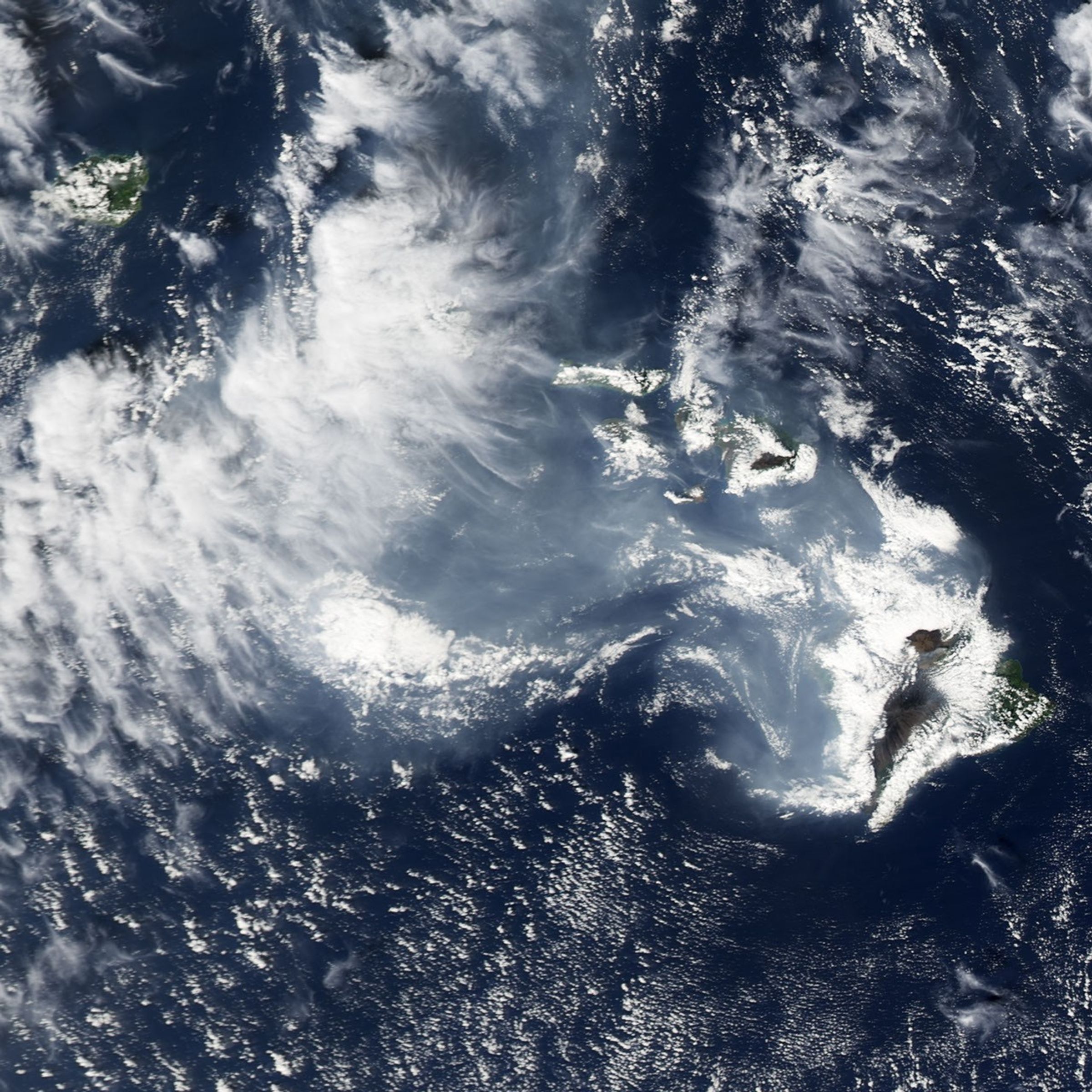 Dense, gray-white haze hung low over the Hawaiian Islands on December 3, 2008, when the Moderate Resolution Imaging Spectroradiometer (MODIS) on NASA’s Aqua satellite captured this image. Though seldom so thick or widespread, the haze is common in Hawai'i. It forms when sulfur dioxide from the islands’ volcanoes mixes with oxygen and water in the atmosphere. The tiny sulfate particles that make up vog reflect light well so that vog shows up easily when viewed from space. On December 3, the vog stretched from Hawai'i west and north to Maui, Kaho'olawe, Lana'i, and Moloka'i before disappearing beneath a bank of clouds.