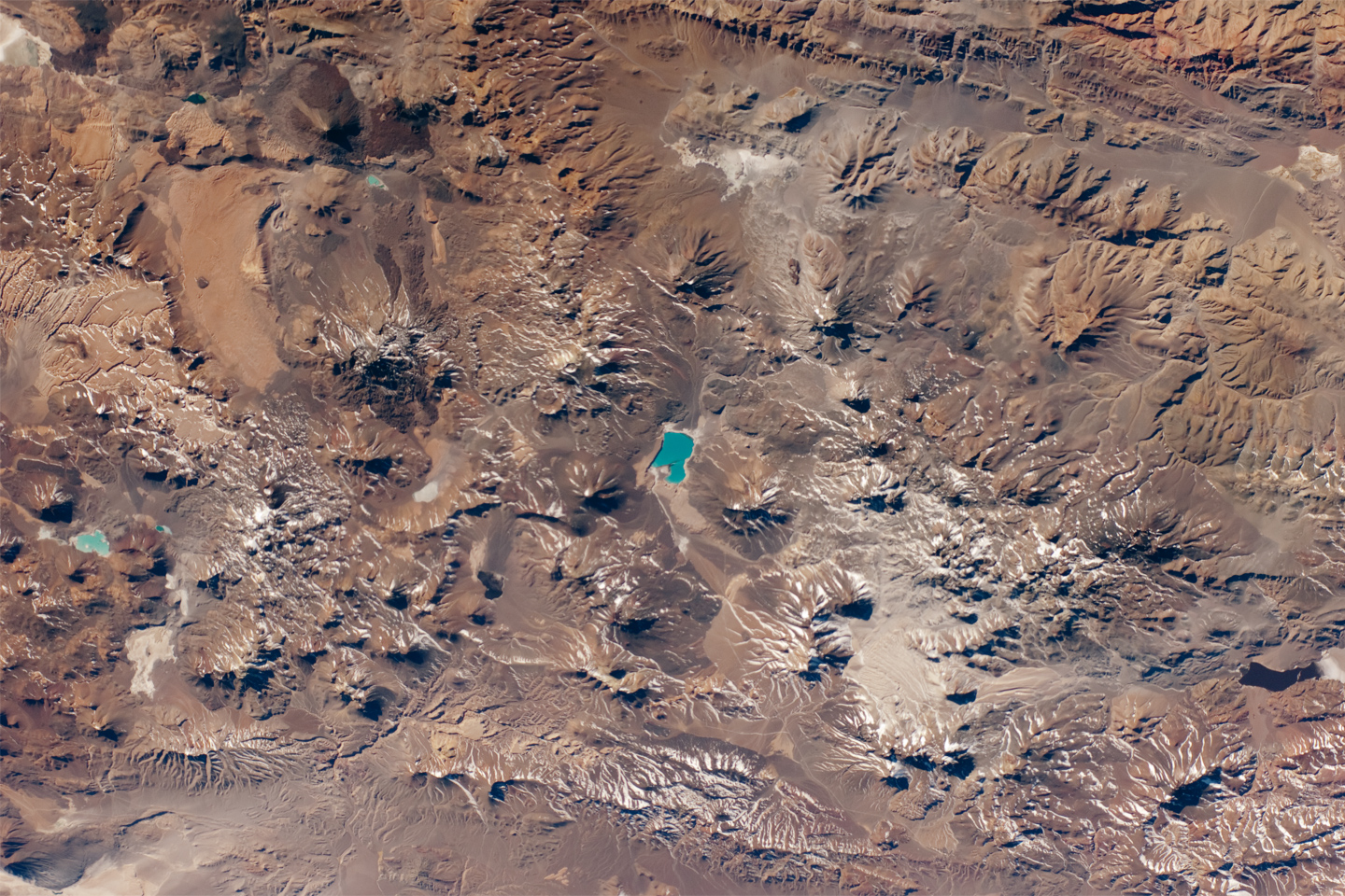Also visible is the world’s highest active volcano, Nevado Ojos del Salado, with a summit 6,887 meters (22,600 feet) above sea level. The most recent confirmed eruption has been dated to the year 700 (+/- 300 years), but minor eruptive activity may have occurred as recently as 1993.