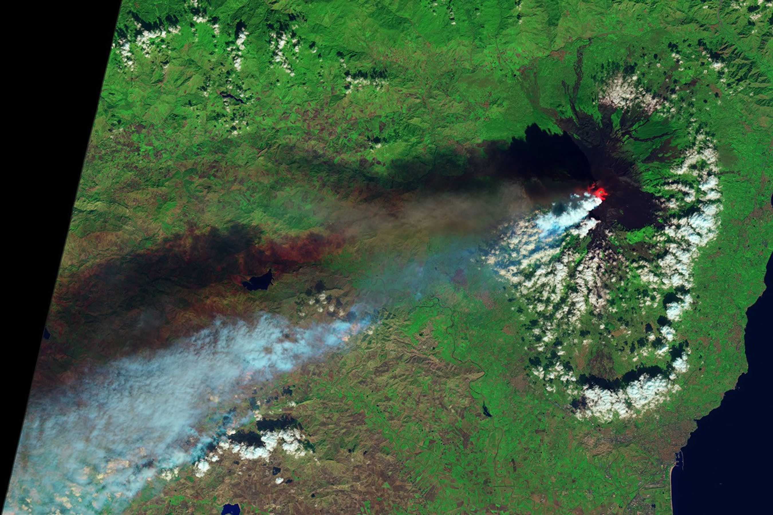 This natural-color image (top) collected by Landsat 8 shows the view from space at 11:38 a.m. local time. The towering, gas-rich plume cast a dark shadow over the lower, ash-rich plume and Etna’s northwestern flank. Relatively fresh lava flows (less than a century or so old) are dark gray; vegetation is green; and the tile-roofed buildings of Bronte and Biancavilla lend the towns an ochre hue.