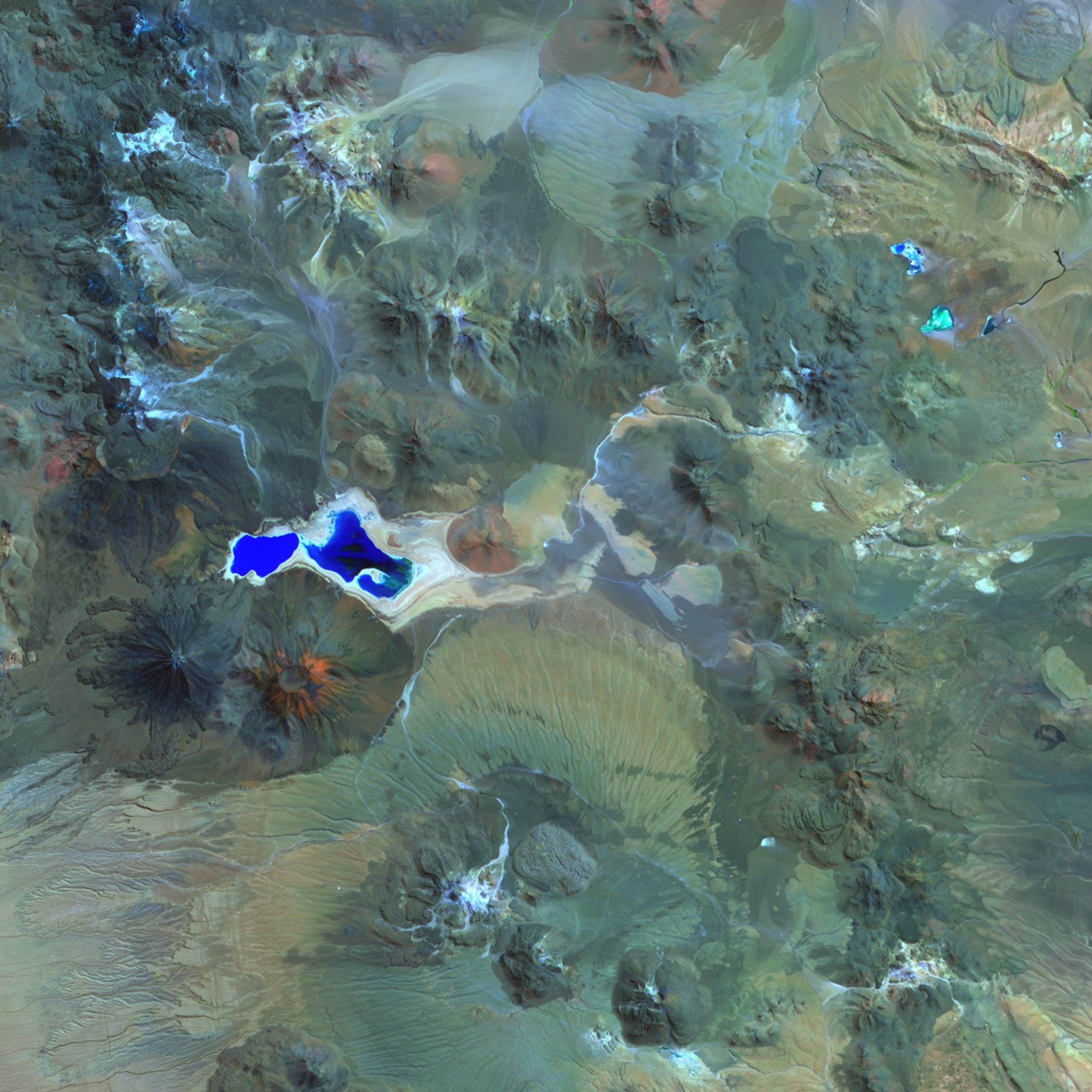 Among the most interesting sites are the lakes—the one in the caldera of the volcano itself and the one at the base of the volcano. Pictured here in this false-color image from the Advanced Spaceborne Thermal Emission and Reflection Radiometer (ASTER) on the Terra satellite, the latter lake stands out in sapphire blue to the northeast of Licancabur (the solid charcoal peak). The microscopic plant life that survives in this lake is under increasing pressure as the lake, adjacent to the Atacama Desert (to the west), slowly dries up. The former extent of the lake bed now appears in a white ring around the lake. Former river courses, long since dried up, trace pale furrows across the rocky terrain.