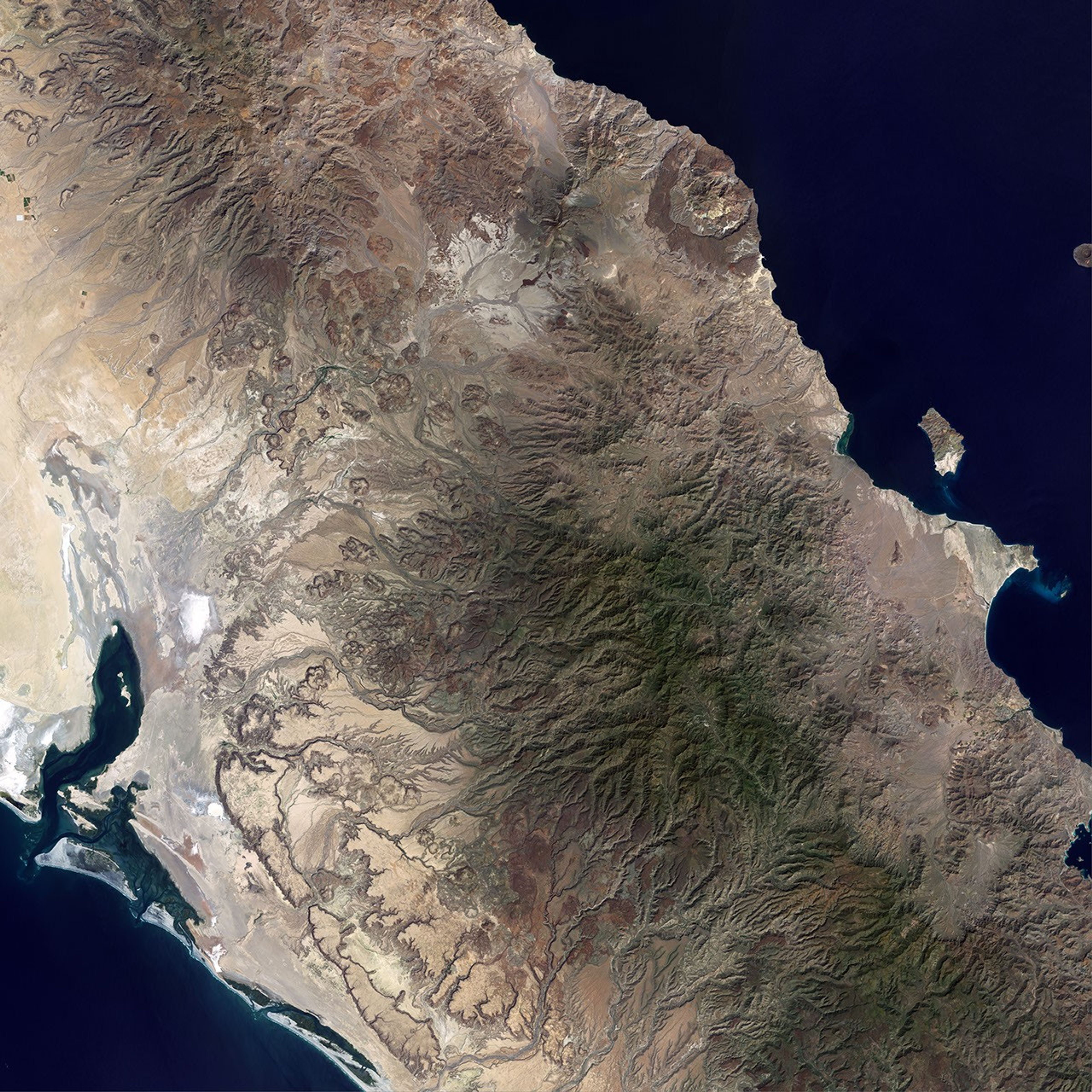The arid climate of Baja California limits the amount of vegetation covering the ground and allows the dramatic volcanic features of the landscape to stand out in this natural-color image from the Landsat satellite on October 5, 2000. The landscape is a patchwork of lava flows and the hardened remains of pyroclastic flows—hot clouds of volcanic ash, dust, and rock fragments that race down the slopes of a volcano like an avalanche.