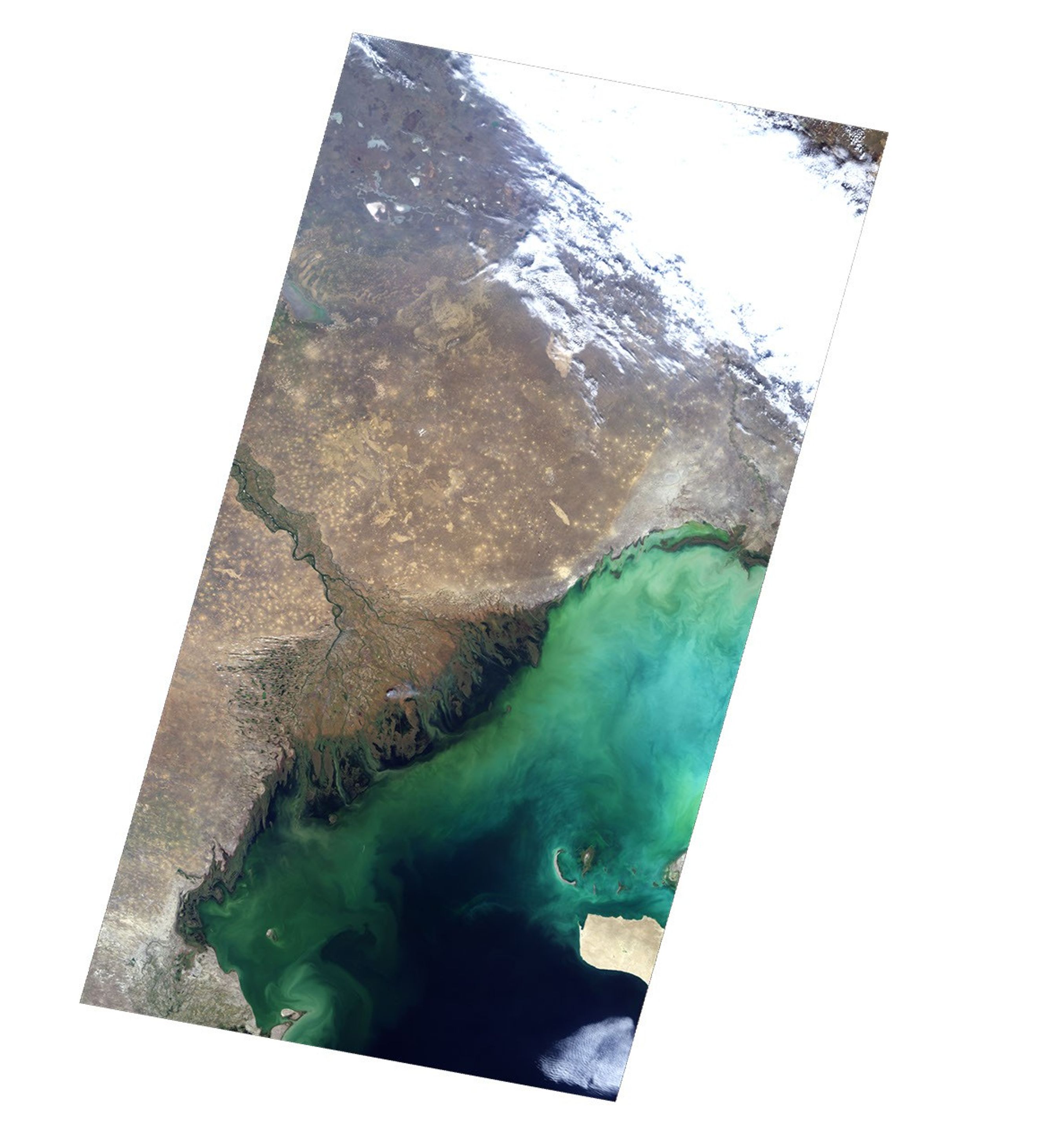 Russia’s Volga River is the largest river system in Europe, draining over 1.3 million square kilometers of catchment area into the Caspian Sea. The brackish Caspian is Earth’s largest landlocked water body, and its isolation from the world’s oceans has enabled the preservation of several unique animal and plant species. The Volga provides most of the Caspian’s fresh water and nutrients, and also discharges large amounts of sediment and industrial waste into the relatively shallow northern part of the sea. These images of the region were captured by the Multi-angle Imaging SpectroRadiometer (MISR) on October 5, 2001, during Terra orbit 9567.
