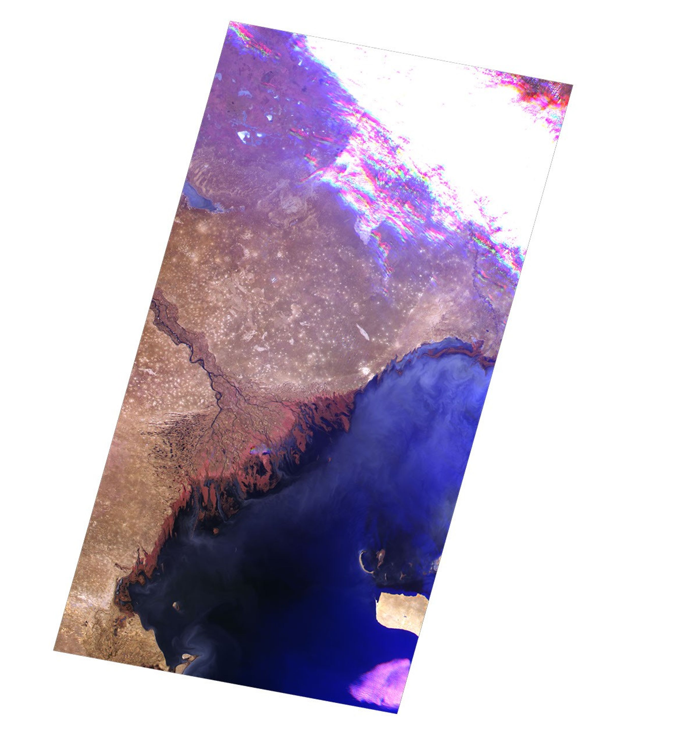 Other notable features within the images include several linear features located near the Volga Delta shoreline. These long, thin lines are artificially maintained shipping channels, dredged to depths of at least 2 meters.
