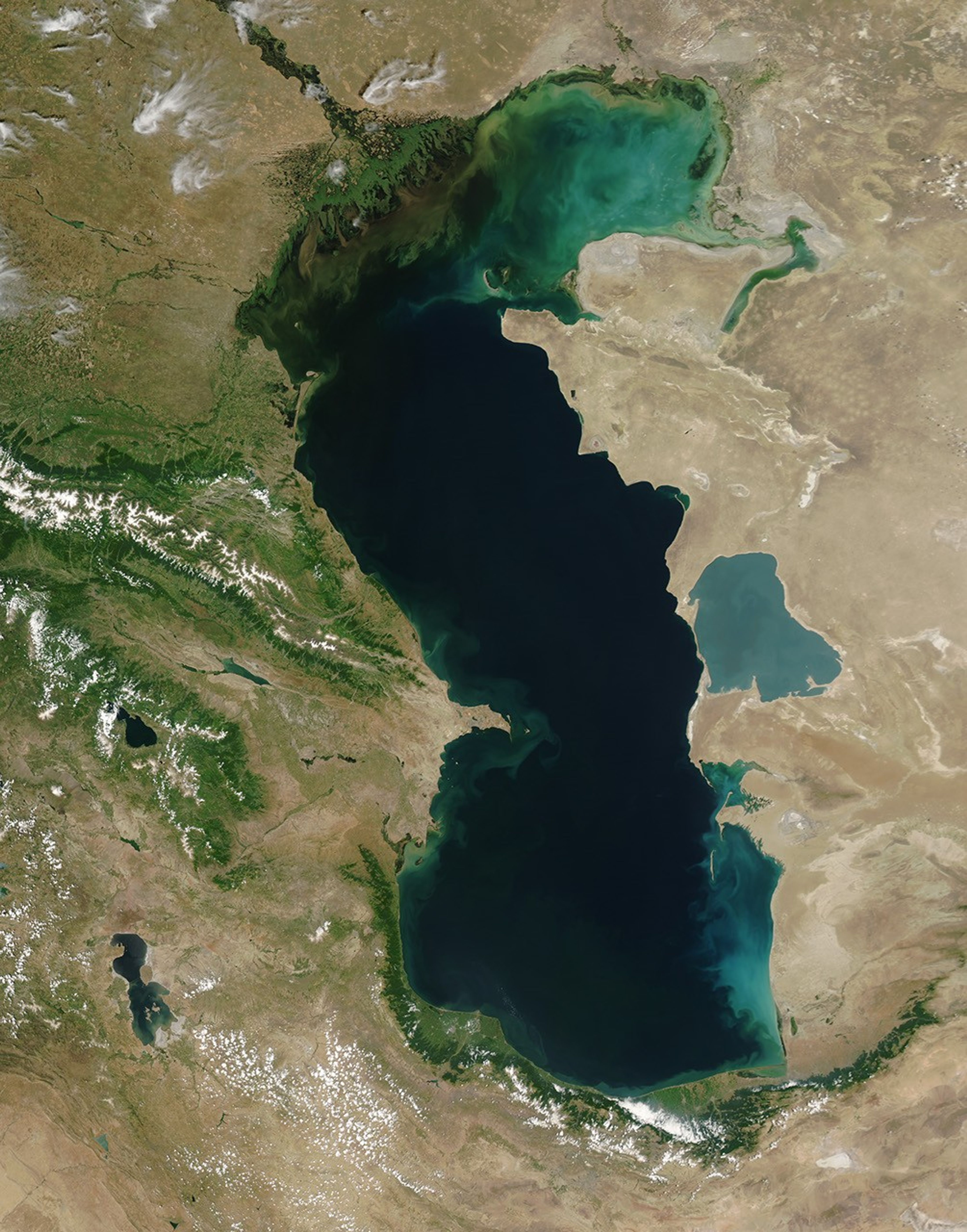 The added fertilizers nourish the algal blooms that grow on the surface of the sea, allowing them to grow larger. When they die, the plants begin to sink and are consumed by bacteria. A thick layer of decaying plants can suck all of the oxygen out of the water, leaving pockets of oxygen-poor water where fish cannot survive. For this reason, large algal blooms can result in fish kills. While most of the green seen in the Caspian Sea in this image appears to be diluted mud, some may be phytoplankton or algal blooms, particularly in the lower right corner of the image.