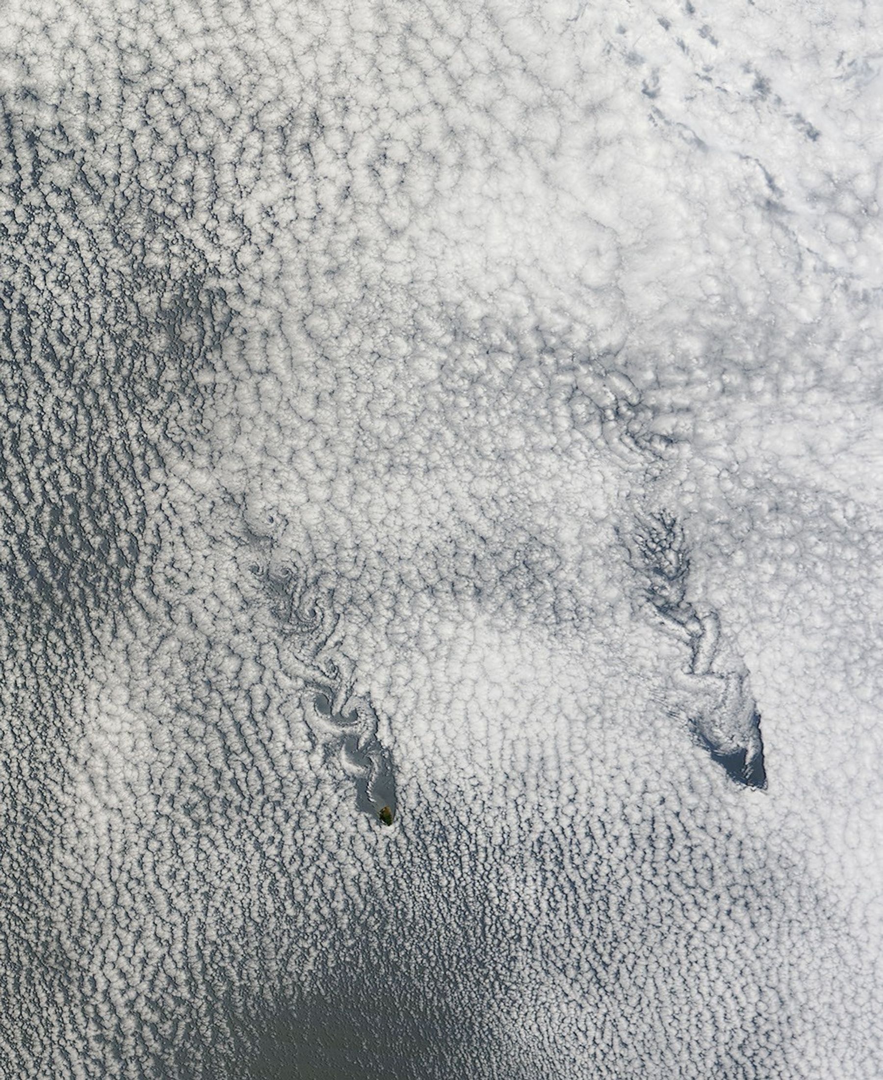 The islands are tall enough to disturb air flow over the ocean. When an object such as an island interferes with the movement of air, von Karman vortices form in the air on the downwind (or leeward) side of the island. Also known as vortex streets, they are double rows of spiral eddies that are made visible by the clouds.