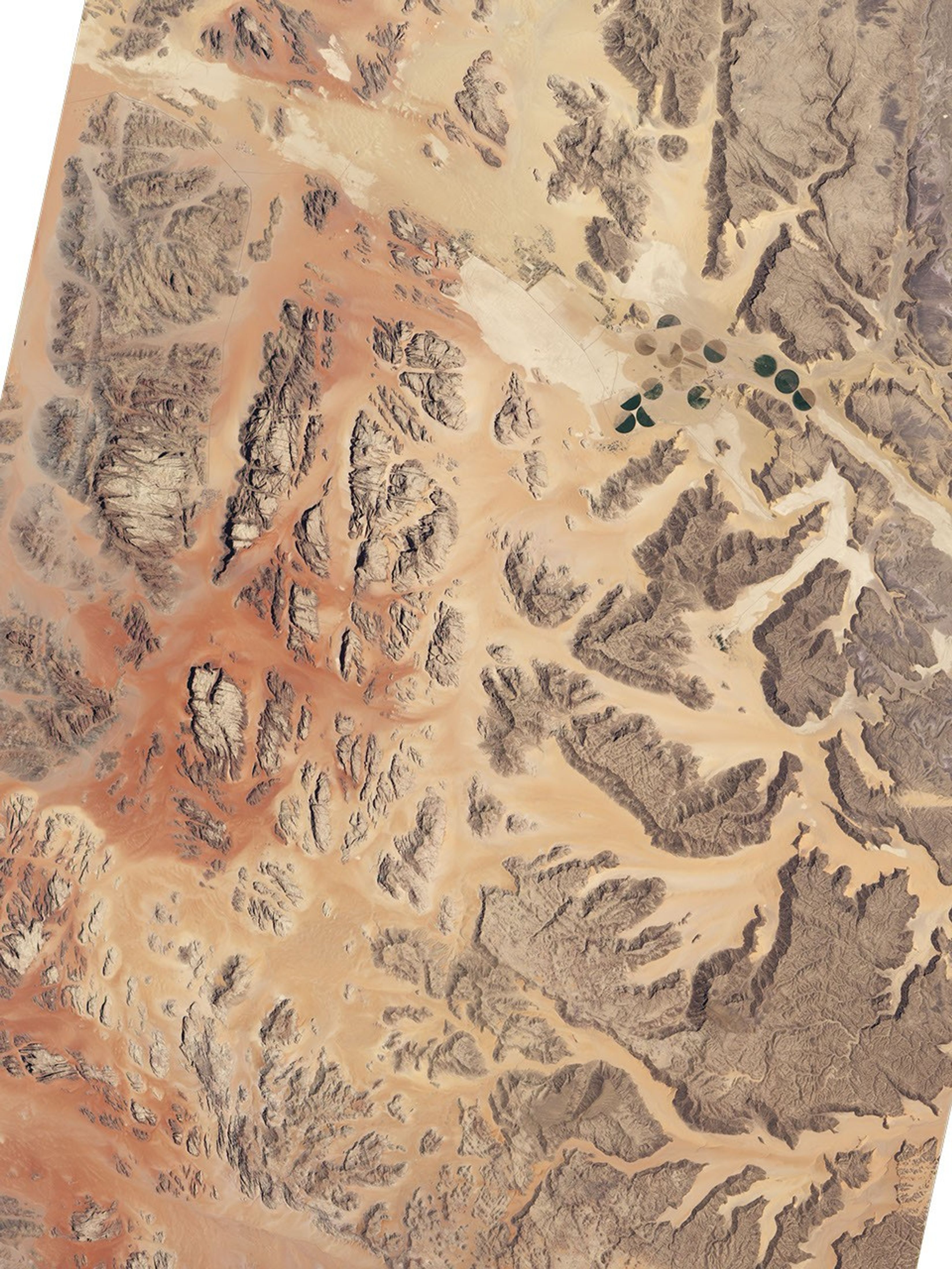 The Advanced Land Imager (ALI) on NASA’s Earth Observing-1 (EO-1) satellite captured this natural-color image on July 27, 2001. The scene includes part of Wadi Rum and an adjacent area to the east. East of the protected area, fields with center-pivot irrigation make circles of green and brown (image upper right). As the earth tones throughout the image attest, the area is naturally arid, receiving little annual precipitation and supporting only sparse vegetation. Between rocky peaks, the sandy valleys range in color from beige to brick.