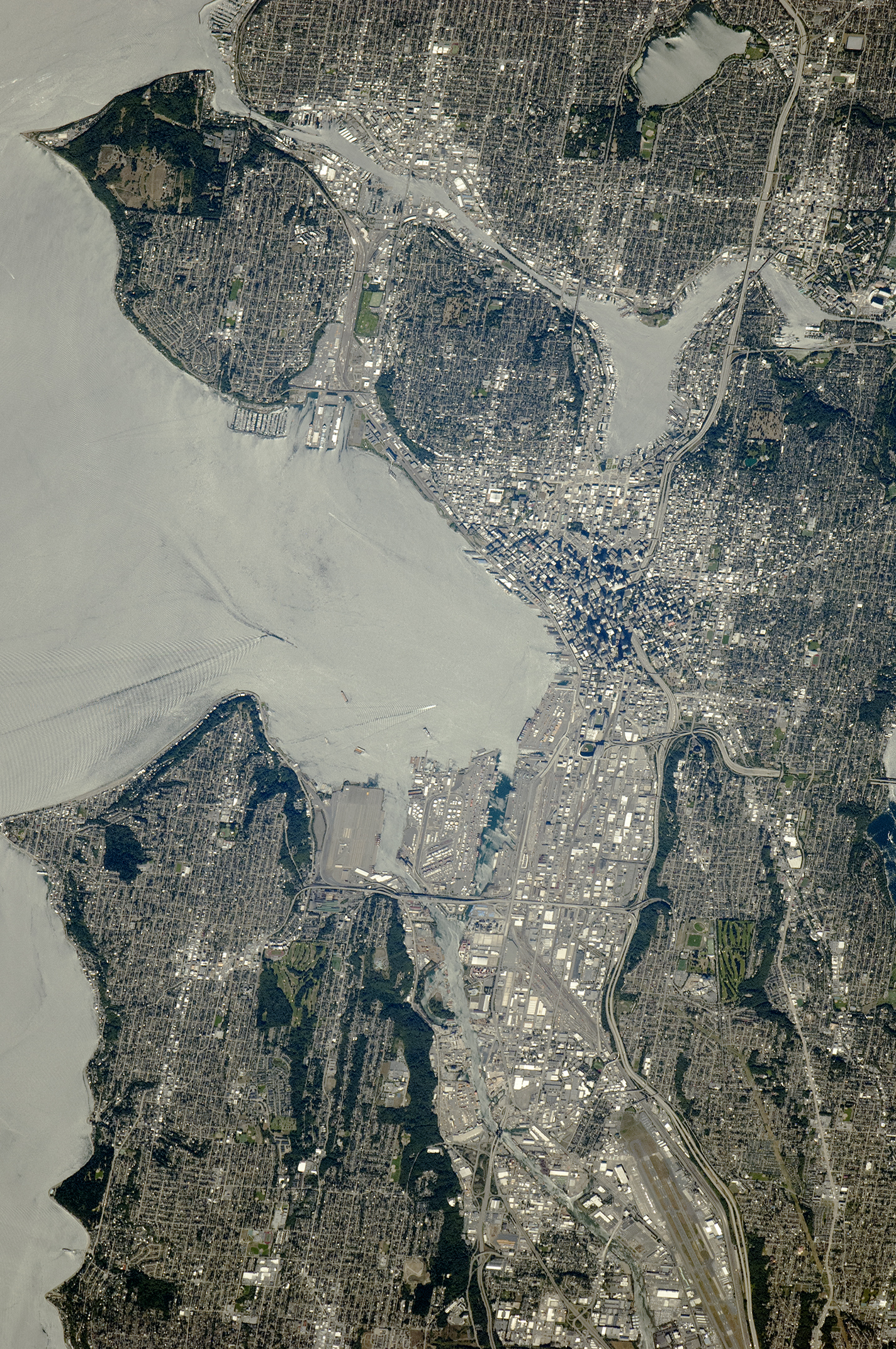 The land shown in the photo is Seattle, Washington. The darkest areas with rectangular grids are suburbs richly covered with trees. The broadly gray zones of the city center are brighter where buildings are lower (as in Harbor Island), and darker where the high-rise buildings of downtown cast shadows. Interstate Highway 5 bisects downtown.