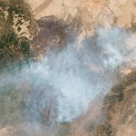 The newly burned land left in the wake of the Wallow Fire is dark red in this false-color image taken on June 15, 2011. The image, acquired by the Landsat 5 satellite, is made with infrared light. The slightly blue blur is smoke, and dots of bright orange-red on the south side of the burn are active fires. Unburned forest is green, and sparsely vegetated land is pink.