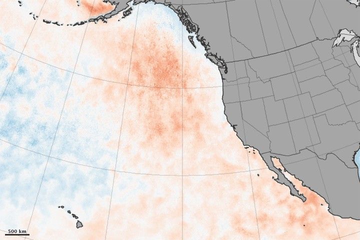 According to a paper published on April 6, 2015, in Geophysical Research Letters, a large parcel of the northeastern Pacific became exceptionally warm and calm in the winter of 2013-14, and that pattern has continued. The patch of water—1,600 kilometers (1,000 miles) wide and as much as 100 meters (300 feet) deep—sat below a strong and persistent ridge of high atmospheric pressure that kept winds light. The fair weather kept surface waters from mixing; cooler waters from the deep did not rise, nor did cooler currents from near Alaska. This also meant less heat and moisture rose into the atmosphere.