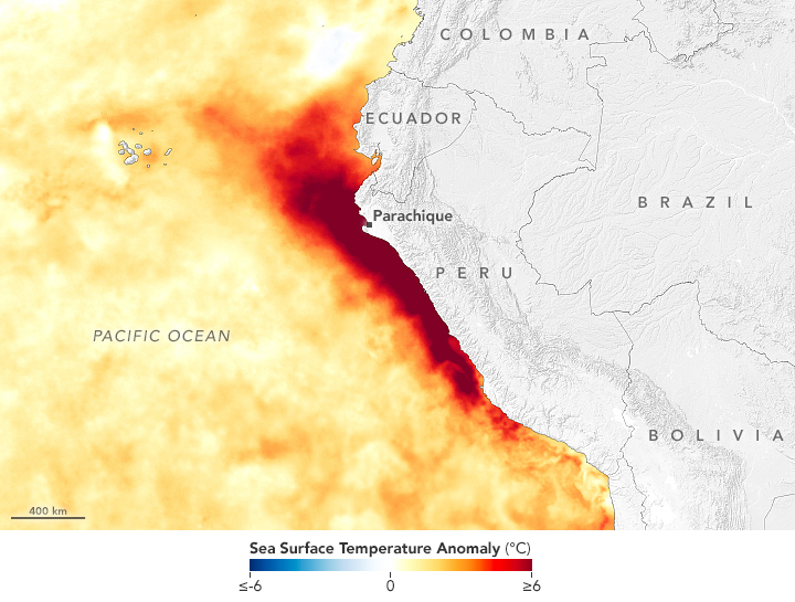 The map below shows sea surface temperature anomalies on April 4, 2023. Surface waters were roughly 6°C (10.8°F) warmer than usual offshore of Peru for that date, according to data from the Multiscale Ultrahigh Resolution Sea Surface Temperature (MUR SST) project. MUR SST blends measurements of sea surface temperatures from multiple NASA, NOAA, and international satellites, as well as ship and buoy observations. (Scientists also use instruments floating within the sea to project underwater temperatures.)