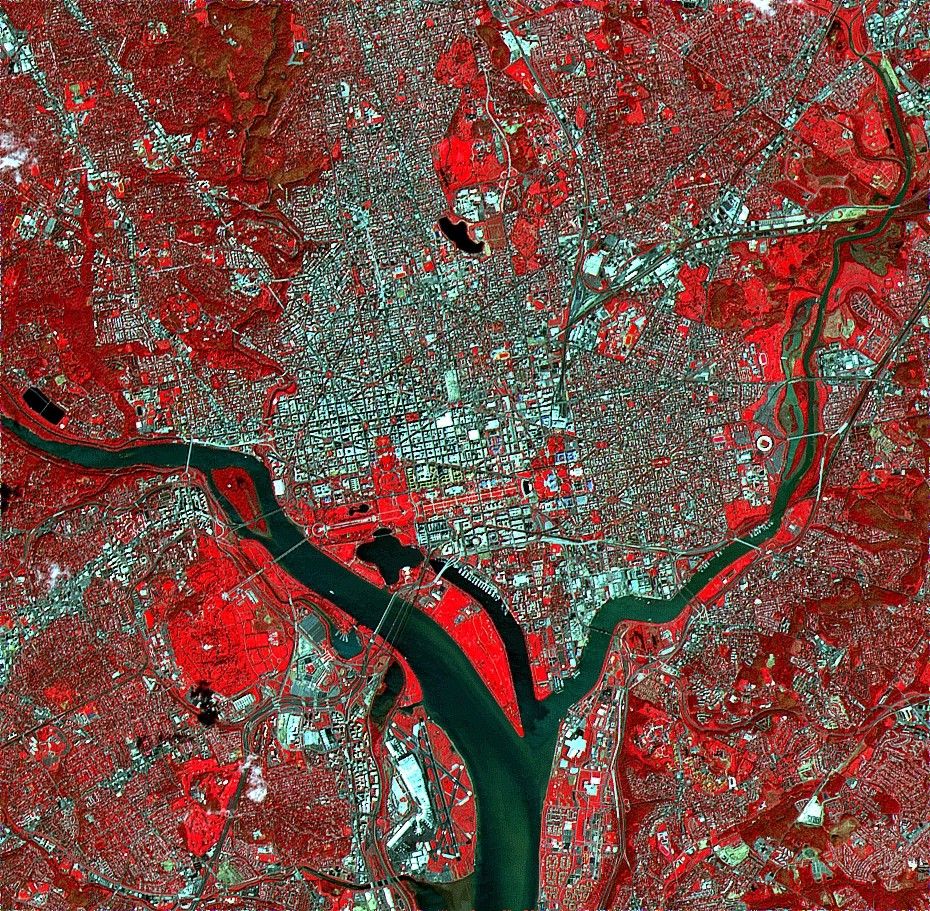 The scene encompasses an area 14 km wide by 13.7 km tall, and was madeusing a combination of ASTER’s visible and near-infrared channels. Inthis image, vegetation appears red, buildings and paved areas appearlight blue, and the waters of the Anacostia and Potomac Rivers are darkgrey. ASTER’s 15-meter spatial resolution allows us to see individualbuildings, including the White House, the Jefferson Memorial, and theWashington Monument with its shadow.