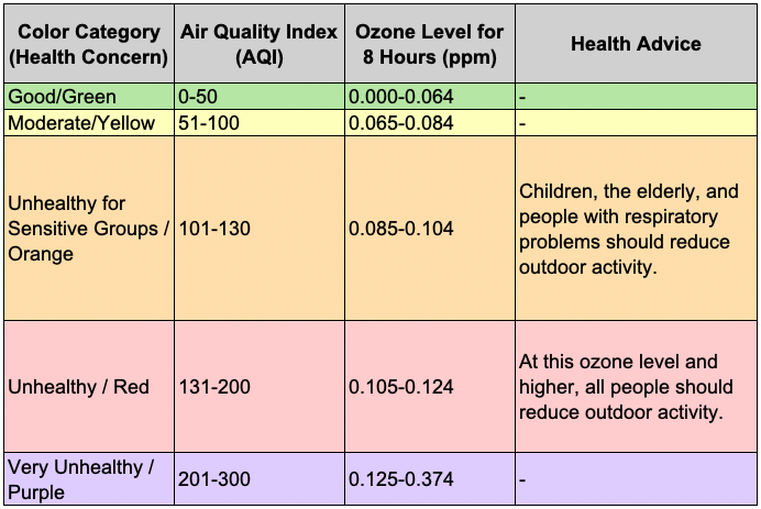 In 1999, the EPA revised the format of its Air Quality Index (AQI) to make it useful to the public. This index depicts ozone levels in five categories of increasing health concern, each with an associated color. If the air is Code Orange, Red, or Purple, an alert is in effect, and the public can take action to avoid overexposure to ozone. Federal, state, and local agency, newspapers, broadcast news, and Internet publications use the index when reporting on air quality information.
