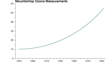 How much more ozone are we breathing because of our fossil fuel consumption? Researchers began measuring ozone in Europe about 125 years ago, when ozone concentrations peaked at around 10 parts per billion in a given volume of air (ppb). Although the technique of ozone measurement then was to observe ozone’s oxidation of potassium iodide on paper (Schonbein paper) and was less accurate than current techniques, modern studies have reexamined these procedures and concluded that we can depend on them. (Fishman, 2002) An assessment of the global rate of increase of tropospheric ozone is difficult to determine from measurements at only a few locations, but we know that the global level has increased significantly over the last 100 years.