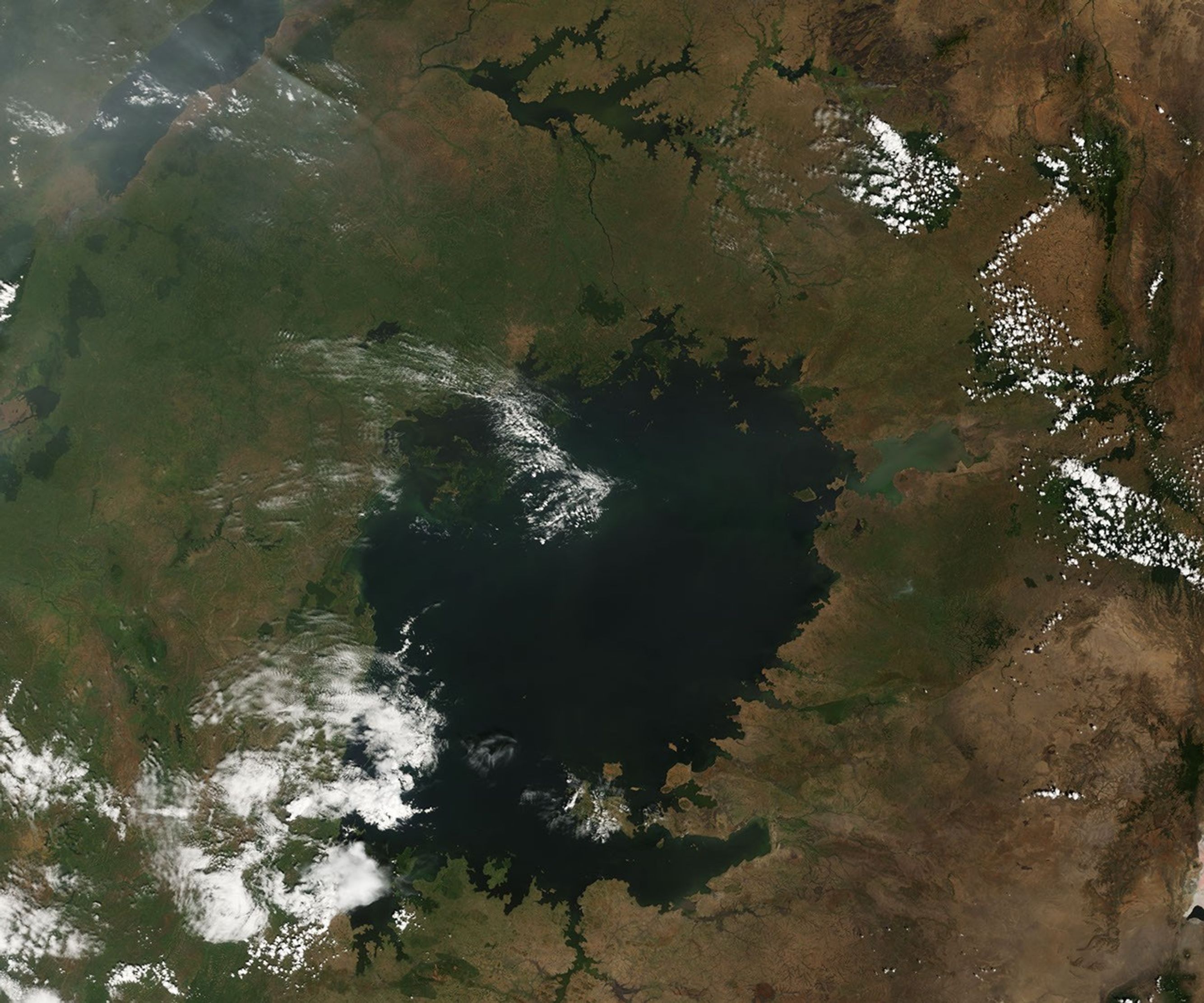 These images show the Winam Gulf, in the northeast corner of Lake Victoria in Kenya. The gulf was the most severely affected region during the first hyacinth outbreak in 1998, with as much as 17,231 hectares (67 square miles) of the plant growing on its surface. By 2000, the area covered by water hyacinth was down to about 500 hectares (2 square miles), and in December 2005, when the right image was taken, the lake appeared to be clear. In November and December 2006, however, unusually heavy rains flooded the rivers that feed into the Winam Gulf. The rain and floods raised water levels on the lake and swept agricultural run-off and nutrient-rich sediment into the water. As a result, the Winam Gulf was brown when the Moderate Resolution Imaging Spectroradiometer (MODIS) on NASA’s Terra satellite took the top left photo-like image on December 18, 2006. Vegetation around the lake was dramatically greener due to the rains.