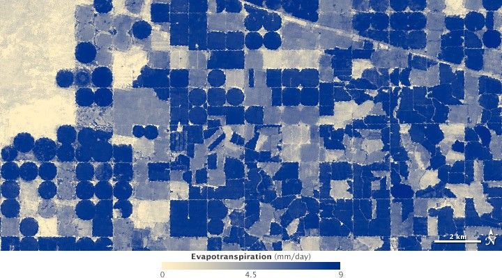 Since they could now calculate how much of the available energy was heating the ground and the air, they could estimate how much was being used for evapotranspiration. In other words, they now had a way to see water “spending” for every 900-square-meter area of land (a 30 meter pixel): they could see just how much water was being consumed from field to field.