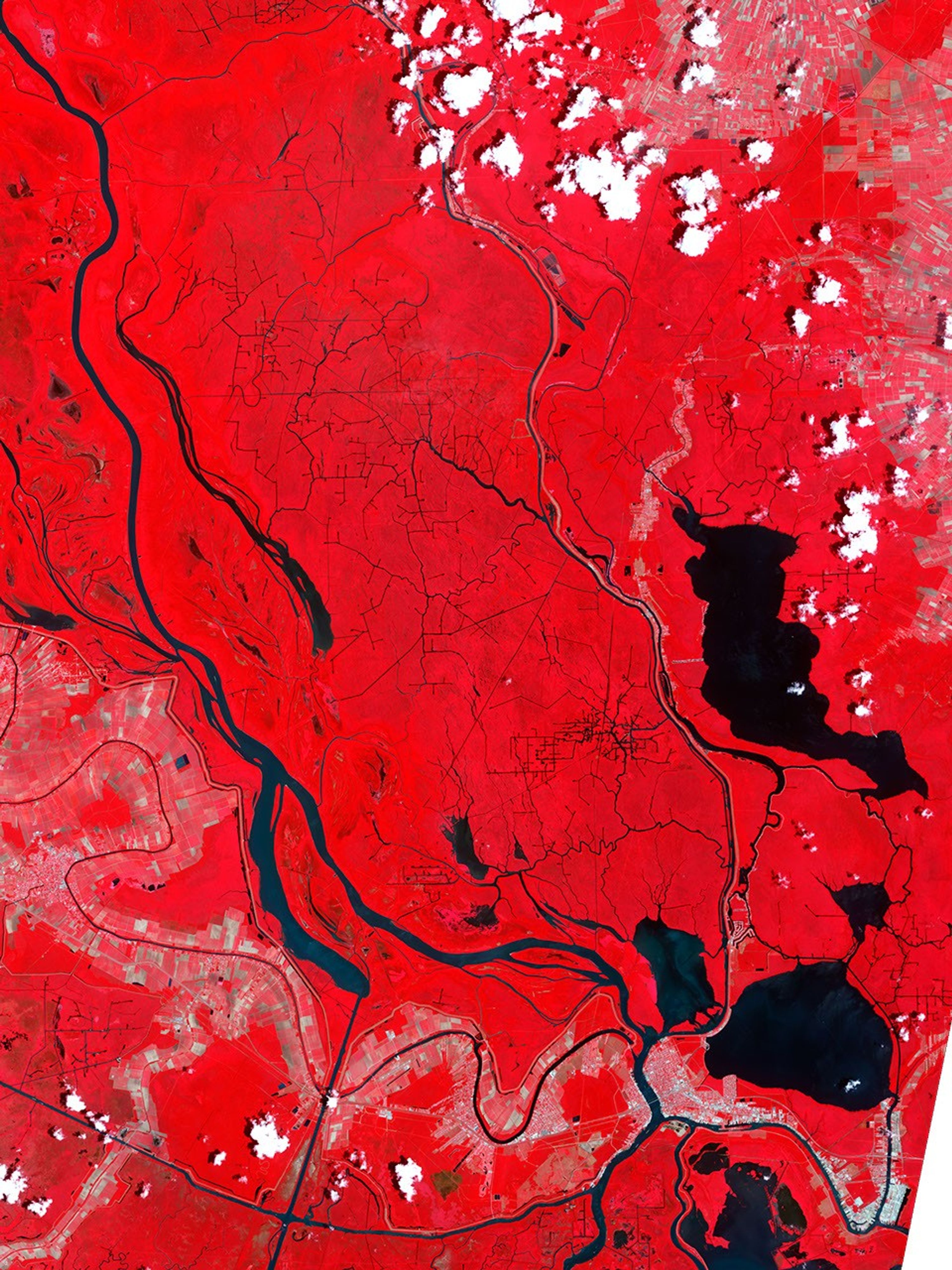 Two weeks after the U.S. Army Corps of Engineers opened the flood control structure known as the Morganza Spillway, the Advanced Spaceborne Thermal Emission and Reflection Radiometer (ASTER) on NASA’s Terra satellite captured this false-color image of the downstream area above Morgan City, Louisiana.