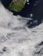 In the duck’s case, the motion across a stationary surface triggers the waves. A similar process can play out when air flows over a stationary object. That’s what was happening when the Moderate Resolution Imaging Spectroradiometer (MODIS) on NASA’s Terra satellite acquired this image of mountain-wave clouds near the Auckland Islands. The wave-driven clouds are flowing in an easterly direction on the lee side of the small archipelago about 450 kilometers (280 miles) south of New Zealand’s South Island.