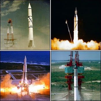 Wernher von Braun's teams with the Army and NASA developed many of the rockets that launched America into the space race. Clockwise from upper left: the Redstone (first U.S. Army ballistic missle), Juno-1 (carried Explorer 1, the first U.S. satellite), Mercury-Redstone (launched Allan Shepard, the first American in space), and the Saturn-1 (booster rocket for the Apollo missions). (Photographs courtesy MSFC Image Exchange)