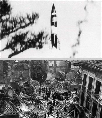 The V2 rocket was the world's first ballistic missle. It was first launched in 1942, and used offensively from September 1944 until March 1945. During World War II Nazi Germany fired V2s from mobile launchers (above, top) towards major urban targets such as London and Antwerp (above, lower). (Photographs courtesy of the A4/V2 Resource Site).