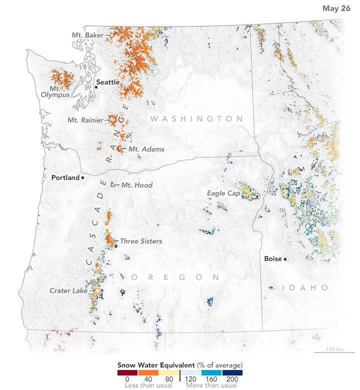 A warm and dry spring in the Pacific Northwest quickly depleted the seasonal snowpack, raising concern over summer water supplies and wildland fire risk.