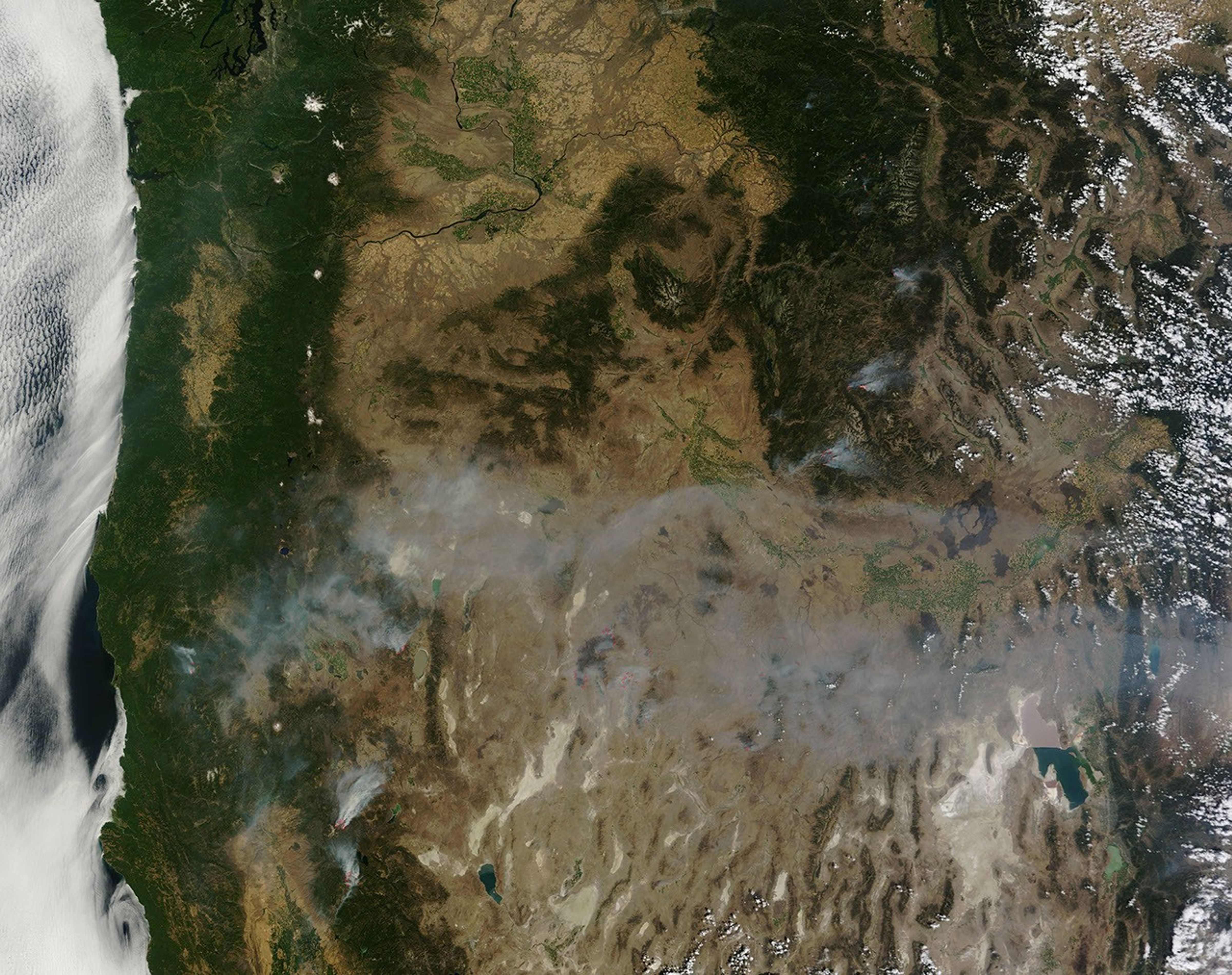 Wildfires raged across Colorado earlier this summer. Now California, Idaho, Nevada, and Oregon are feeling the heat. On August 14, 2012, numerous fires blazed across the four western states, burning through everything from sagebrush to grass to beetle-killed lodgepole pine forests.