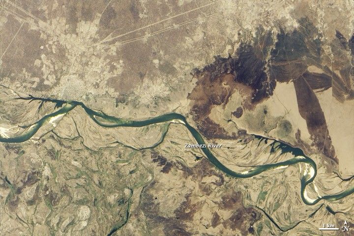The Zambezi River flows through braided channels, and the main channel appears swollen in March 2013; its bluer color indicates greater water depth. But the differences in the floodplain dwarf changes in the channels. Where browns and tans of dried vegetation and burn scars prevail in the dry season, green plant life is revived in the wet season. The water-loving floodplain grasses surrounding the Zambezi River depend on annual floods and seasonal rainfall that is relatively abundant compared to much drier areas to the west.