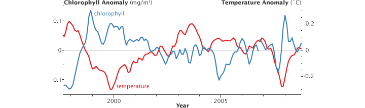 Compared to the ENSO-related changes in the productivity in the tropical Pacific, year-to-year differences in productivity in mid- and high latitudes are small.