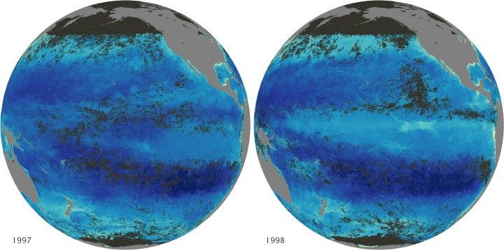 The biggest influence on year-to-year differences in global phytoplankton productivity is the El Niño-Southern Oscillation (ENSO) climate pattern. ENSO cycles are significant changes from typical sea surface temperatures, wind patterns, and rainfall in the Pacific Ocean along the equator.