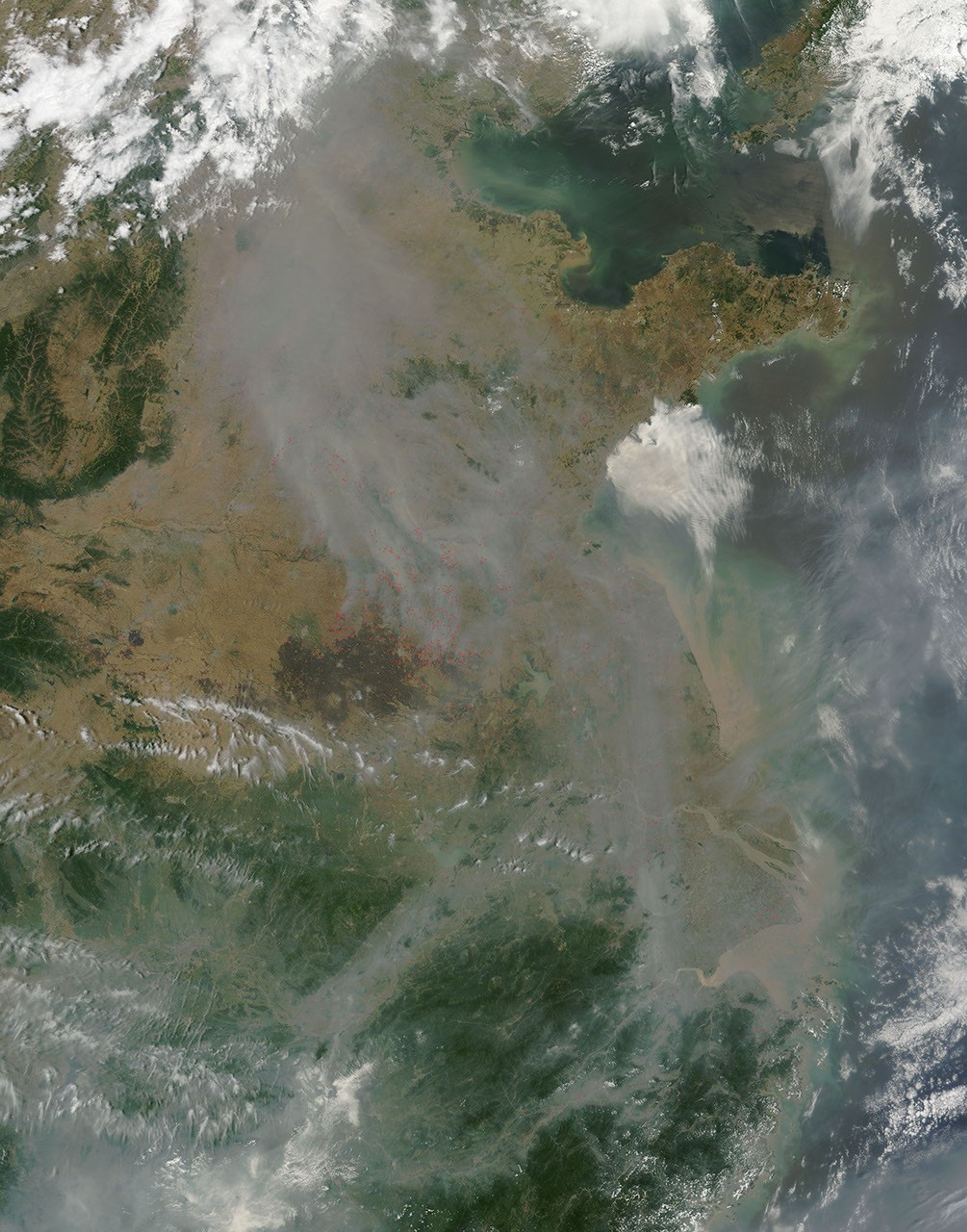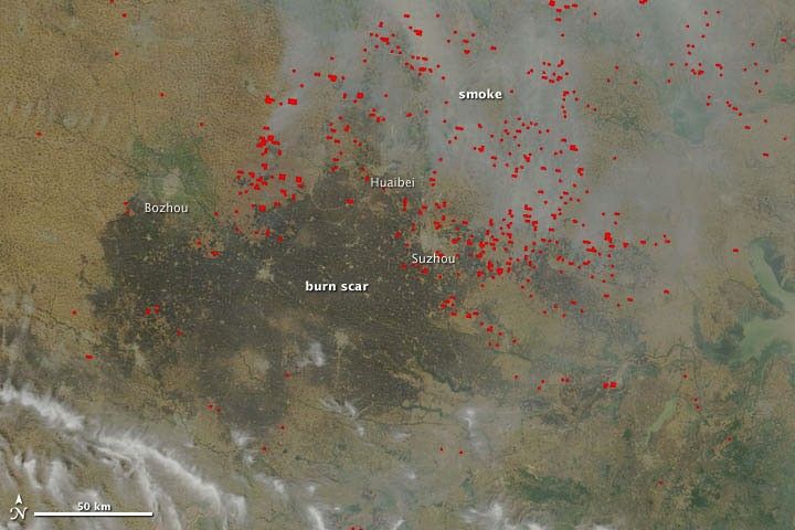 This area falls within the North China Plain, a fertile and densely-populated region that’s home to about a quarter of China's cultivated land and 35 percent of the country's agricultural yields. The area’s staple crops are wheat and maize, and the two crops are generally grown in rotation. Farmers sow winter wheat in mid-October and harvest it at the end of May. In June, farmers burn the remaining plant residue to fertilize the soil for the upcoming maize crop. About 75 percent of all fires in the North China Plain occur in June. A second peak in fire activity occurs in October after the maize harvest.