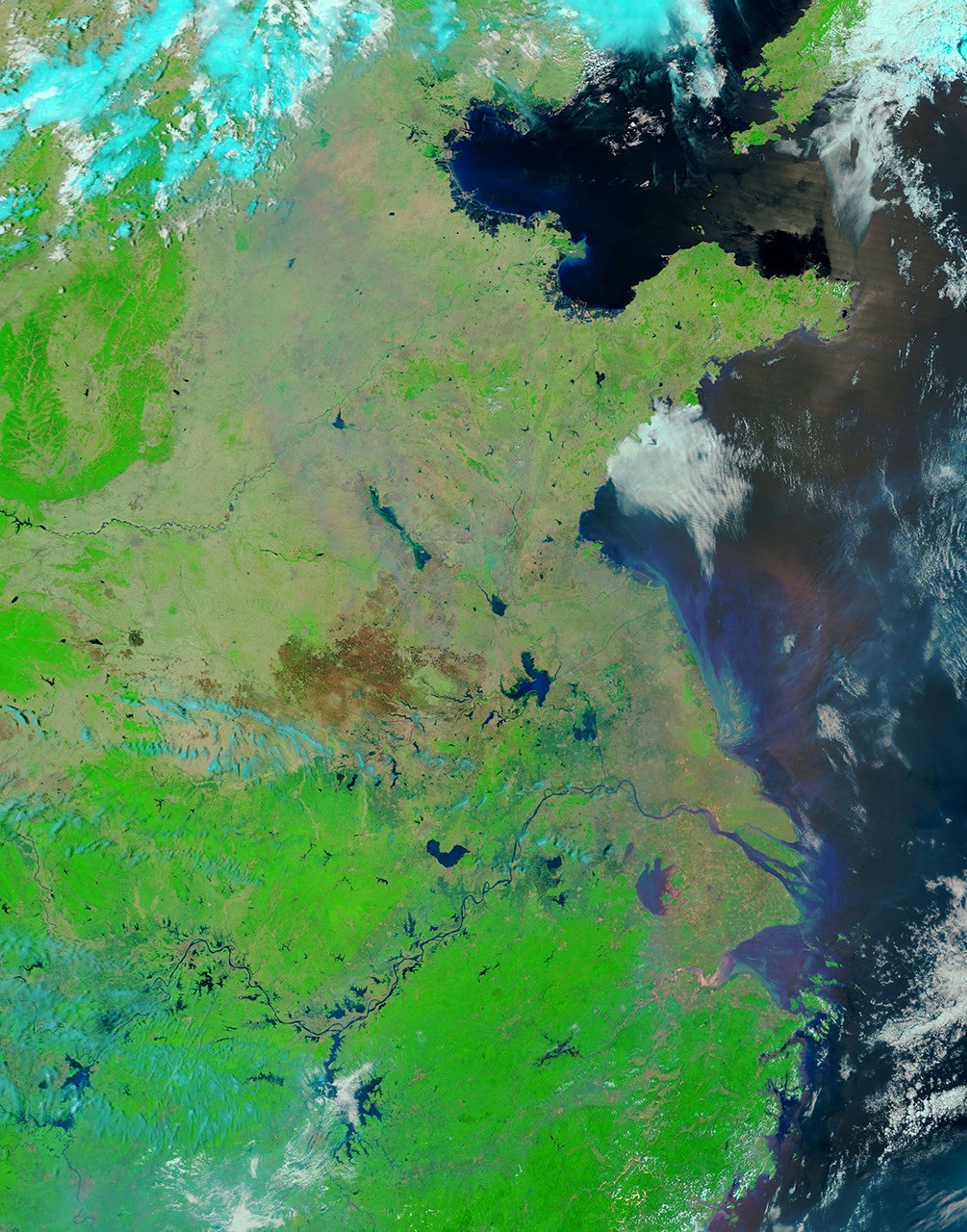 Smoke and actively burning fires (shown with red outlines) are visible in the true-color image, as well as a large burn scar. The false-color image reveals details of the burn scar that aren’t readily apparent in the true-color view. Although the burn scar looks uniform, the false-color view indicates that numerous fields with unburned vegetation (shown as green) are scattered throughout the area. The cities of Bozhou, Huaibei, and Suzhou, which appear as gray patches, were the closest cities to actively-burning fires when Terra acquired the images.