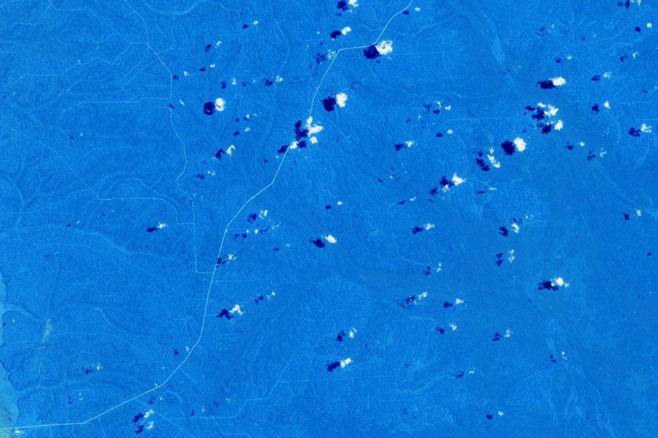 The images above show a logging concession in a wetlands area of northern Congo. Both images were acquired by the Operational Land Imager on the Landsat 8 satellite on April 24, 2019; the natural color view (green background) uses bands 4-3-2, while the false-color (blue background) uses bands 7-6-5. False-color makes it easier for researchers to distinguish between vegetation and bare soil—and therefore easier to spot open, bare soil roads versus abandoned roads with vegetation growing over them.