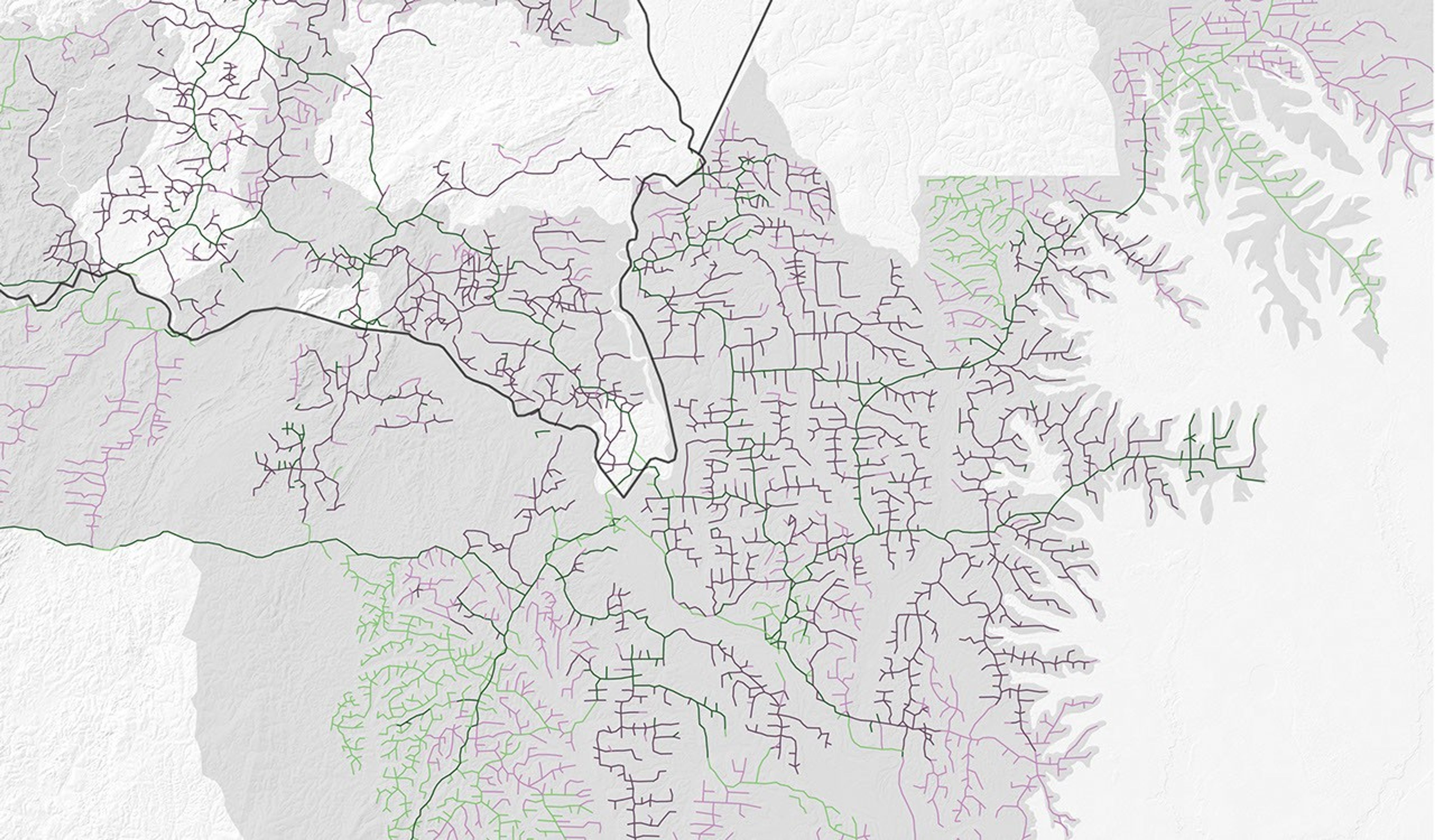 The maps on this page, based on data from Kleinschroth and colleagues, show the extensive road network across central African rainforests. Analyzing thousands of scenes from Landsat satellites, the team documented the three-decade evolution of roads across nearly two million square kilometers (1.2 million square miles). They classified the roads built before 2003 as “old” and those built after 2003 are labeled as “new.” Roads no longer in use are considered “abandoned,” and those still in use are “open.”