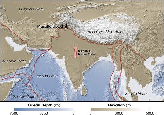 Kashmir lies on the boundary of two colliding tectonic plates: the small Indian plate that underlies most of India and Pakistan, including much of Kashmir; and the vast Eurasian plate that underlies Europe, China, Russia, and much of the Middle East. Jean-Philippe Avouac, a geologist, a professor at the California Institute of Technology, and Director of Caltech’s Tectonics Observatory, studies Asian earthquakes and tectonics. Avouac said, “Northern India is being thrust under the Himalaya, and the mountains are being pushed up by this motion. It’s a small increment of deformation, which over millions of years has built the Himalaya range.” This slow-motion collision created one of the planet’s most active earthquake hotspots; as the plates collide, stress builds up in the fault zones where the plates meet.
