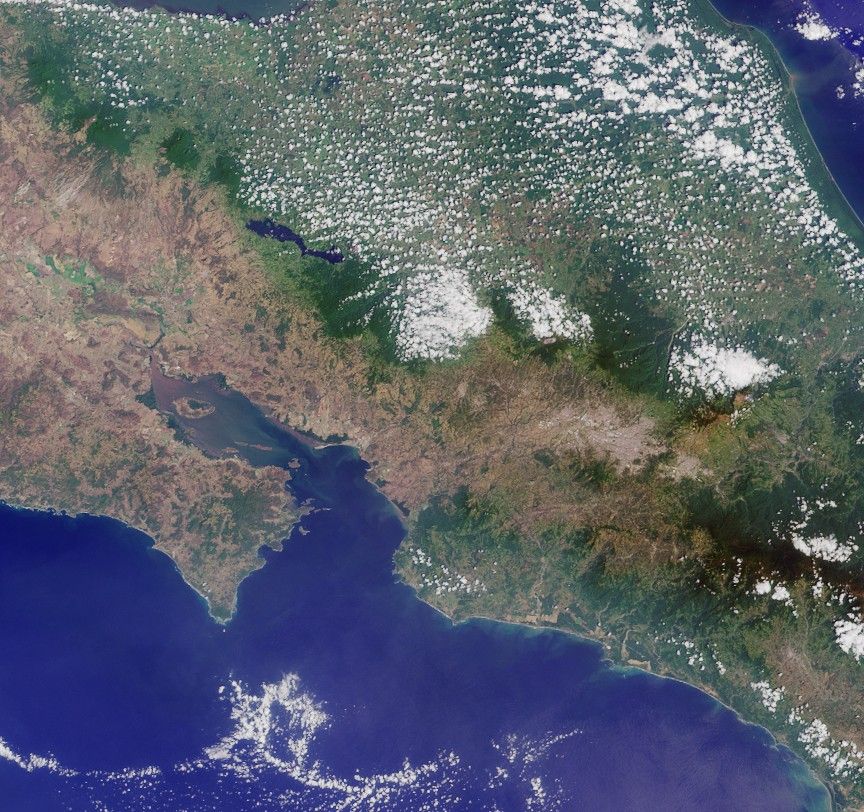 This image was taken by the Multi-angle Imaging SpectroRadiometer (MISR) on the Terra satellite. The image shows an area of about 238 kilometers by 223 kilometers, with north at the top. Please answer the true or false statements about a country within the image, and then tell us where on Earth you think the location is. You may use any reference materials you need to answer the quiz.