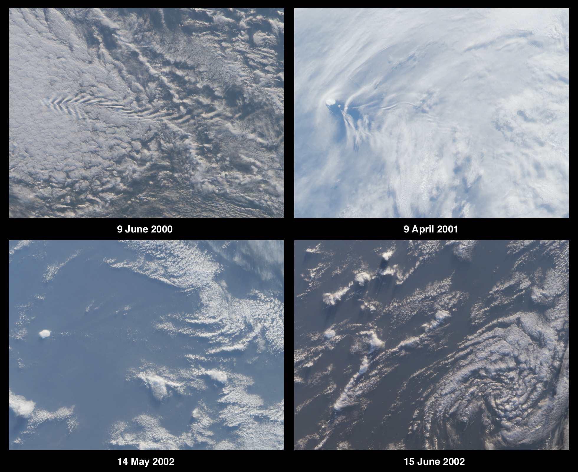 This mystery concerns a small island located near the western edge of theobserved area. In the top two images, the island presents an obstacle to thewesterly winds, and wake patterns in the cloud layers are visible downstream ofthe island’s location. In the lower left image, the island is visible within arelatively clear area of open ocean. In the lower right image, the island ispartially obscured by cumulus clouds, and a spiral cloud pattern associated withan atmospheric depression is visible in the southeast quadrant.