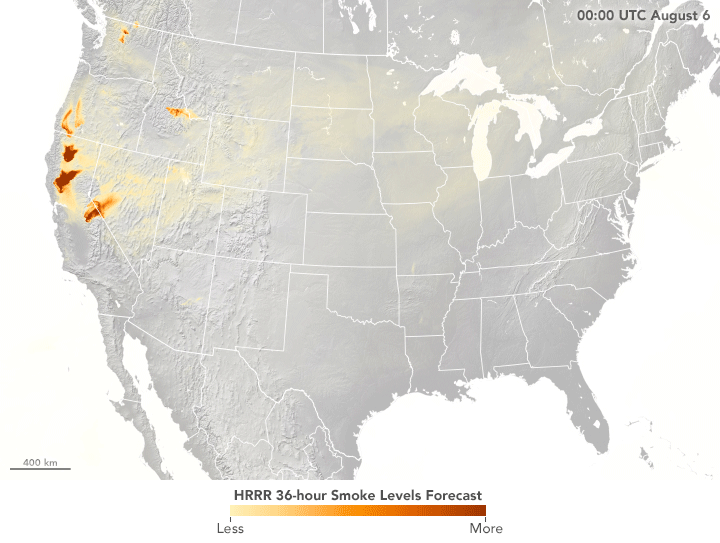 The forecasts include two key sets of predictions. “Near-surface smoke” refers to the smoke that will hover within 8 meters (26 feet) of the ground—the kind responsible for burning eyes and aggravated asthma. “Vertically integrated smoke” depicts all of the smoke in a vertical column, including smoke high in Earth’s atmosphere. That is the smoke you see at sunrise and sunset. The animation below shows a 36-hour forecast of vertically integrated smoke on August 6, 2018.