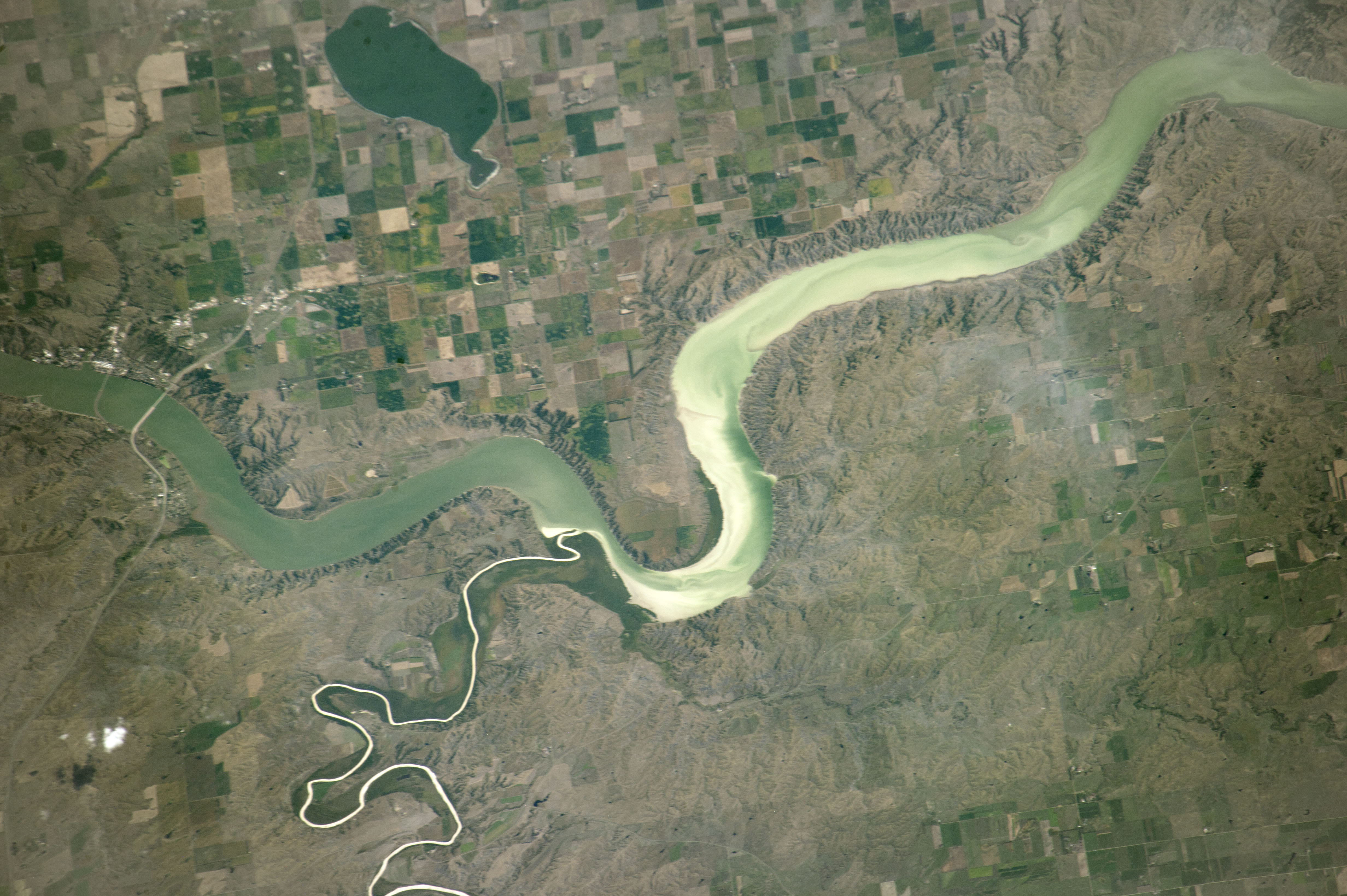 An astronaut aboard the International Space Station focused a camera on the White River where it pours milky-colored water into the blue-green of Lake Francis Case. The White River’s name—Makhízita wakpá, or “White Dirt River” in the Lakota language—derives from the white sediment it carries from erosion and weathering of rocks and soils upstream, especially limestone and volcanic ash from sources near South Dakota’s Badlands. (The white rocks exposed in the Badlands are visible in this photograph from the early days of the ISS.)