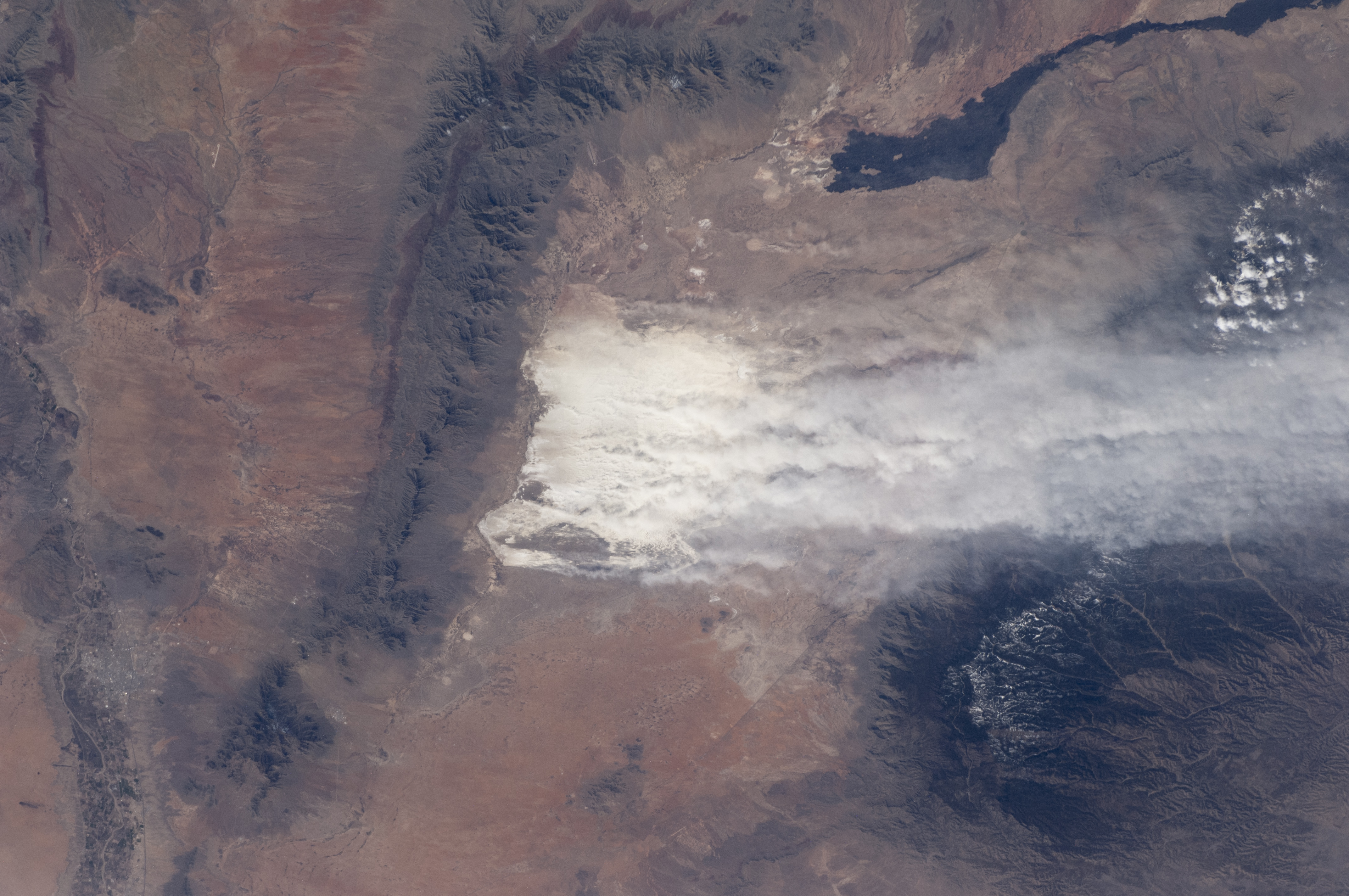 The dust plumes in this astronaut photograph stretch more than 120 kilometers (74 miles). The vigor of the winds also can be judged from the fact that they are lifting dust particles from the valley floor to more than 1200 meters over the mountains. The winds channel the dust through a low point in the mountains, about 800 meters lower than the ridge crests to north and south (image right). The Moderate Resolution Imaging Spectroradiometer (MODIS) on NASA’s Aqua satellite also captured a wider, regional view of the plumes on the same day.