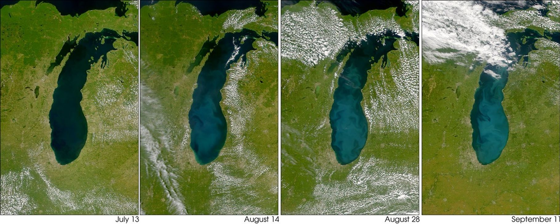 Satellites provide a view from space of changes on the Earth’s surface. This series of images from the Sea-viewing Wide Field-of-view Sensor (SeaWiFS) aboard the Orbview-2 satellite shows the dramatic change in the color of Lake Michigan during the summer. The bright color that appears in late summer is probably caused by calcium carbonate—chalk—in the water. Lake Michigan always has a lot of calcium carbonate in it because the floor of the lake is limestone. During most of the year the calcium carbonate remains dissolved in the cold water, but at the end of summer the lake warms up, lowering the solubility of calcium carbonate. As a result, the calcium carbonate precipitates out of the water, forming clouds of very small solid particles that appear as bright swirls from above. The phenomenon is appropriately called a whiting event. A similar event occured in 1999, but appears to have started later and subsided earlier.