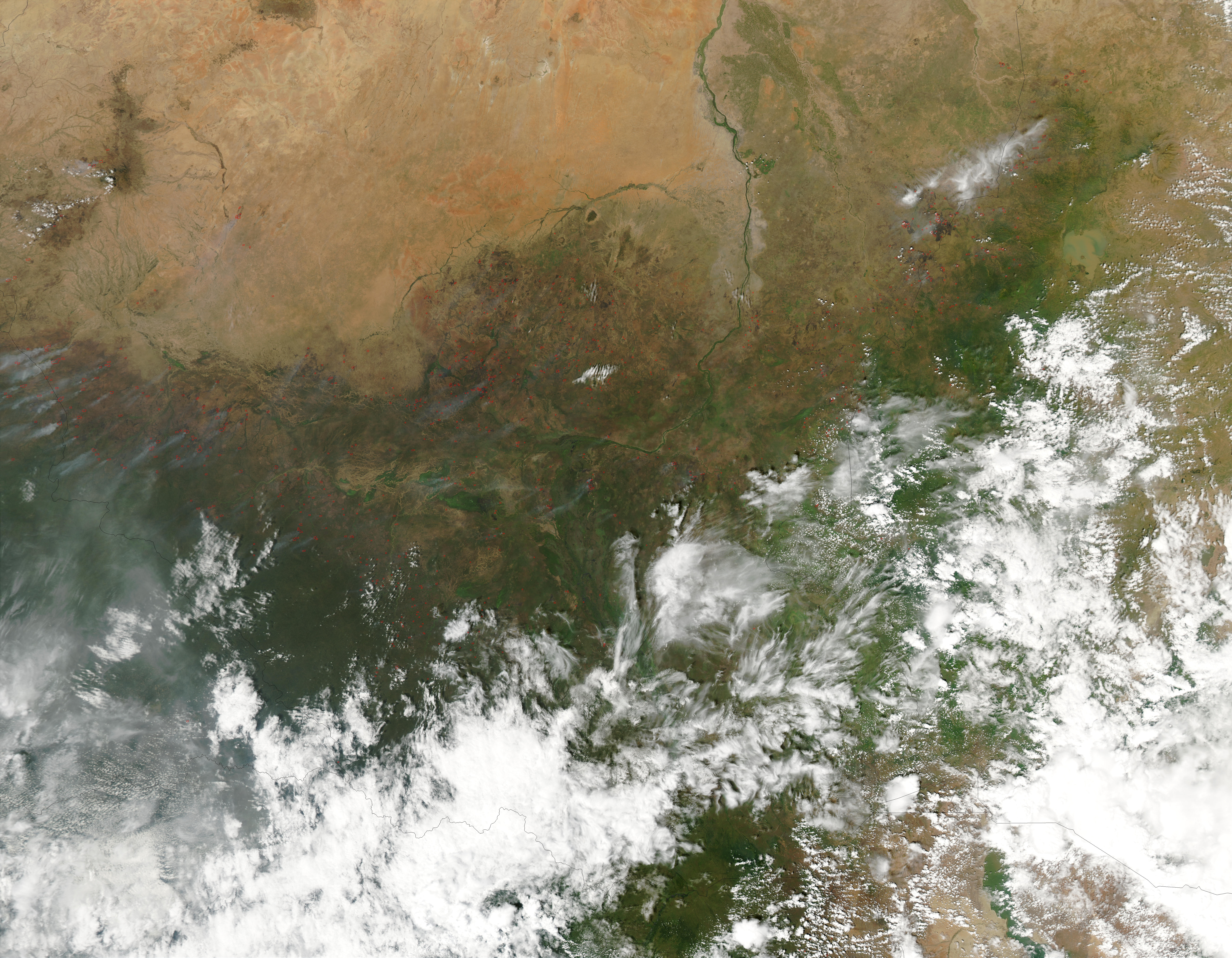 Centered farther west than previous day’s images in this series, this true-color image from the Moderate Resolution Imaging Spectroradiometer (MODIS) on the Terra satellite shows the widespread nature of the fires in central Africa. This image shows fires (red dots)burning in southwestern Sudan (right) and its western neighbor, Chad. Below is the Central African Republic. The fires in Chad are burning in an area that encompasses a broad expanse of wetlands in a region called Salamat.