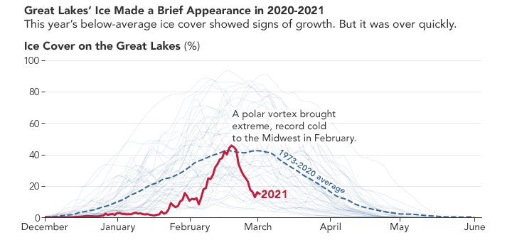 - U.S. National Ice Center (2021, February 26) Great Lakes Reaches Maximum Ice Coverage. Accessed March 4, 2021.