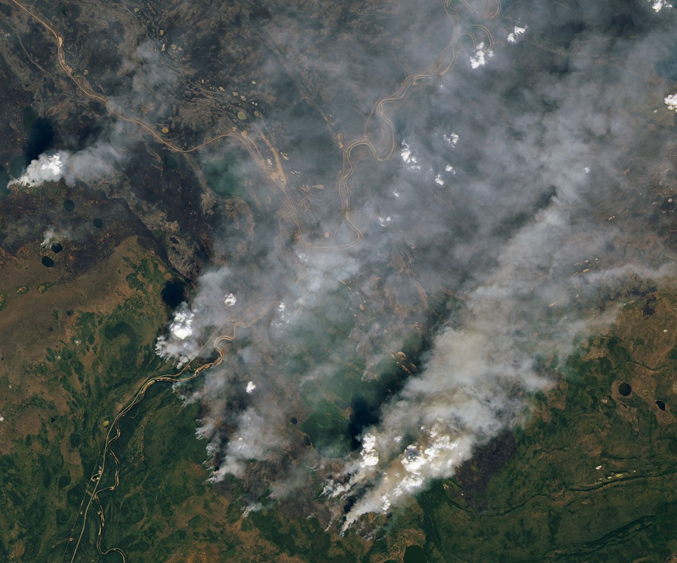 Large wildland fires burning around Yellowknife have prompted Canadian authorities to issue evacuation orders for the city and other nearby communities. The city, the capital of the Northwest Territories, is home to about 20,000 people.The Operational Land Imager (OLI) on Landsat 8 captured an image (top of the page) showing several fires burning near Yellowknife at about 18:50 Universal Time (12:50 p.m. local time) on August 16, 2023. The second image (below) is a more detailed view of a fire burning to the northeast. At the time, active fire fronts appeared to be within 20 kilometers (12 miles) of the city. Recently burned areas appear gray, and unburned forests are green. When the image was acquired, smoke streamed to the northeast.