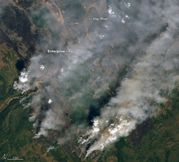 Another fire burning several hundred kilometers southwest of Yellowknife is visible in the third image (below), also acquired by Landsat 8 on August 16. This fire recently overran Enterprise, a small community of about 150 people on the south shore of Great Slave Lake. According to news reports, between 85 and 95 percent of the structures in the community were destroyed.
