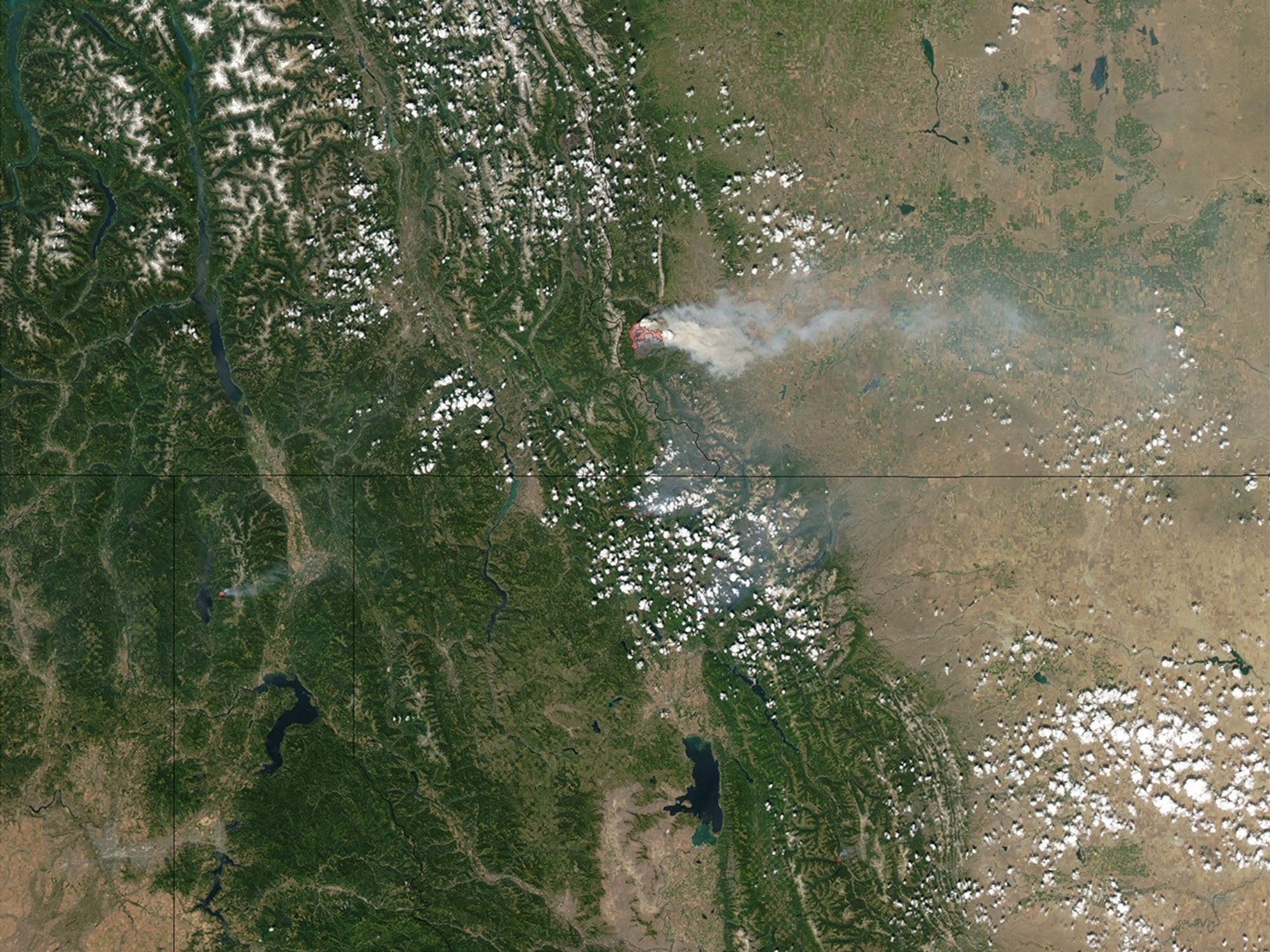 Fast-moving forest fires continued to race through terrain at the front range of the Rocky Mountains in northern Montana (bottom right) and Alberta, Canada (top right), on July 27, 2003. In Montana, the fires (marked in red) forced thousands of tourists and staff to evacuate Glacier National Park (image center) late last week, while in Canada, the blaze forced many residents of the small community of Hillcrest to evacuate their homes on Sunday. The Canadian fire, moving through the forest at almost 27 meters per minute (89 feet per minute), doubled in size to 70 square kilometers (17,297 acres). This image of the fires was captured on Sunday, July 27, 2003, by the Moderate Resolution Imaging Spectroradiometer (MODIS) on the Aqua satellite. Active fire detections made by MODIS are oultined in red.
