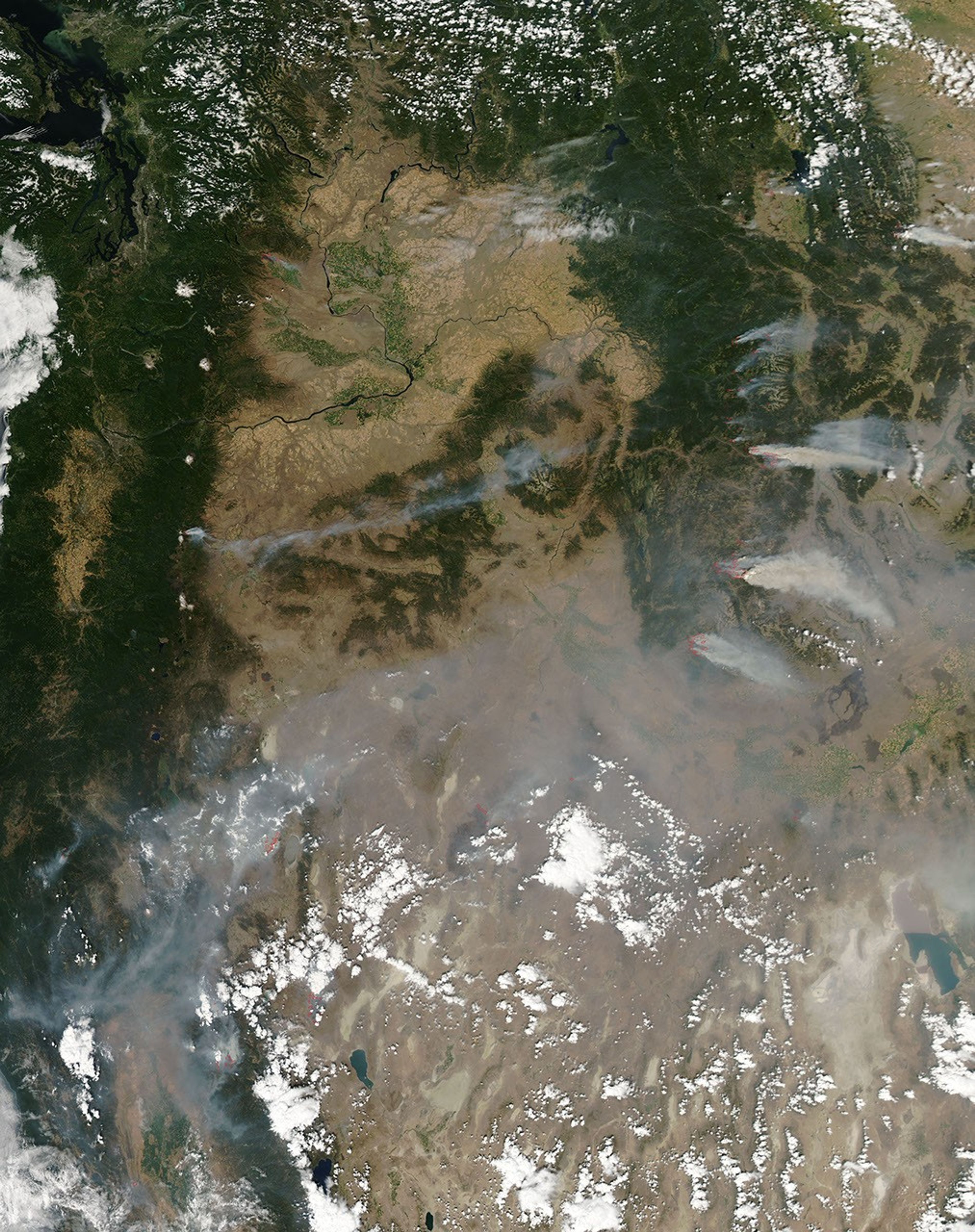 The Moderate Resolution Imaging Spectroradiometer (MODIS) on NASA’s Aqua satellite captured this image of the Idaho fires on Aug 14, 2012. Red outlines indicate hot spots where MODIS detected unusually the hot surface temperatures associated with fires. Thick smoke streamed east, contributing to a cloud of haze that covered much of Wyoming.