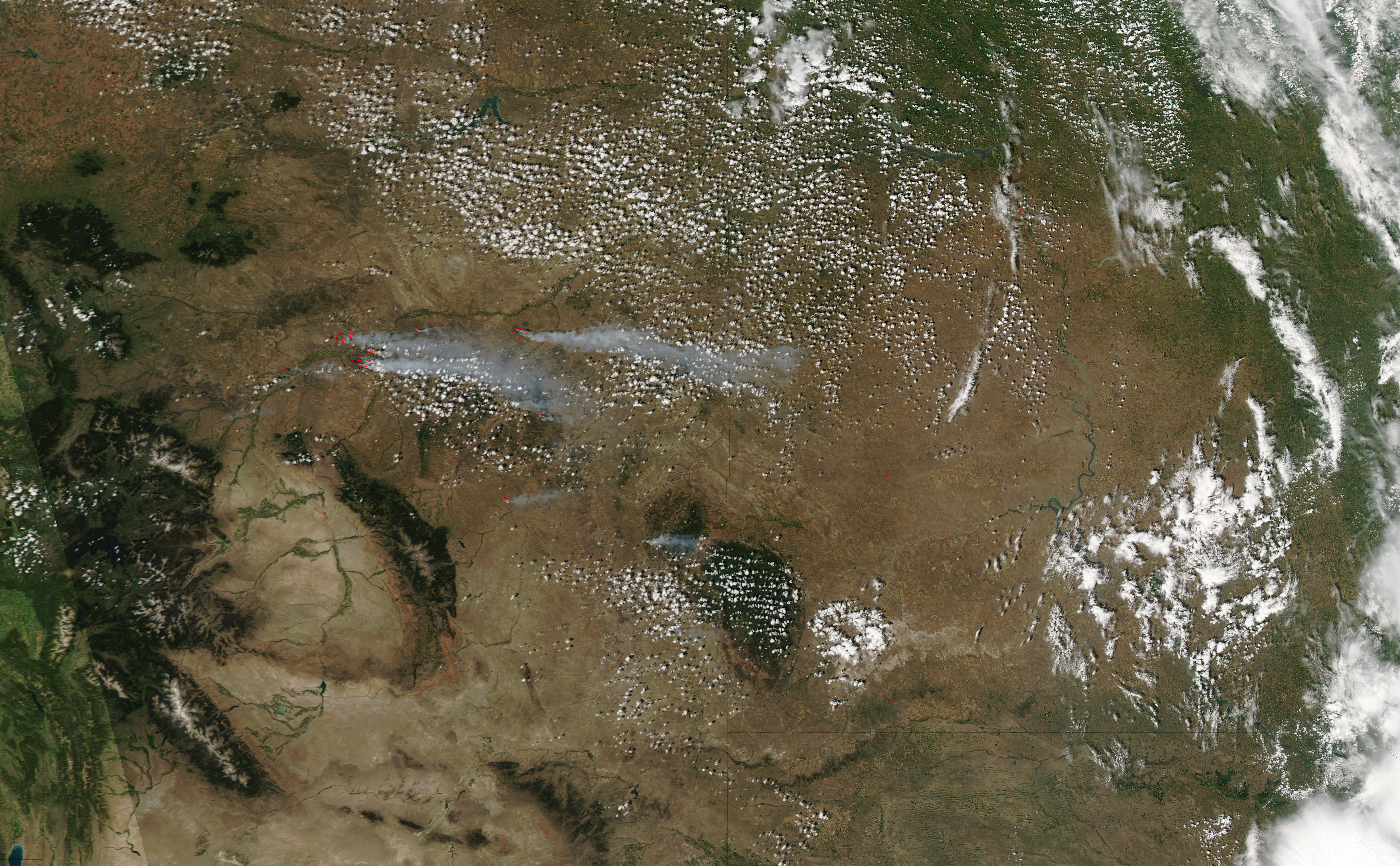 In southeastern Montana and northern Wyoming, the winds were whipping eastward and spreading several large wildfires on July 13, 2006. This image of the area around the Yellowstone, Bighorn, and Powder Rivers was captured by the Moderate Resolution Imaging Spectroradiometer (MODIS) on NASA’s Aqua satellite at 1:35 p.m. U.S. Mountain Time. Places where MODIS detected actively burning fire are outlined in red. Long ribbons of gray smoke stream toward the east. These fires are burning in a mixture of sagebrush, grass, and timber. Many ranches and small communities in the area have been evacuated.