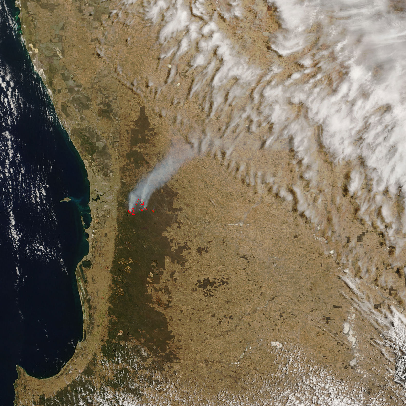 In southwestern Australia, firefighters were working to slow the spread of several large wildfires on the outskirts of Perth in the third week of January 2005. This image of the fires was captured by the Moderate Resolution Imaging Spectroradiometer (MODIS) on NASAâs Terra satellite on January 18. At image left, on the coast, is the city of Perth, and large, smoky fires are burning to the east of the city. The active parts of the fire that MODIS detected are outlined in red.