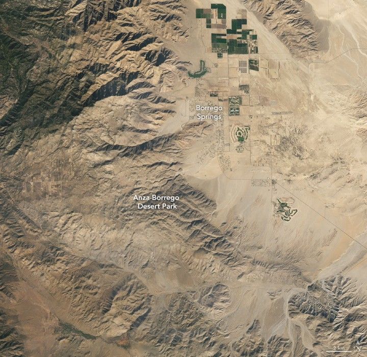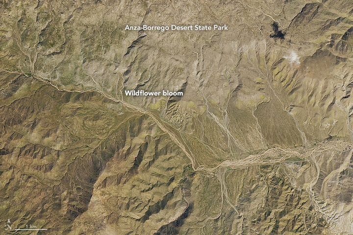 The Operational Land Imager on the Landsat 8 satellite acquired these images of the bloom and of the greening landscape around Anza-Borrego Desert State Park. The images above show a wide view of the region on November 18, 2018 (left) compared to March 13, 2019 (right). The wildflowers, which appear in pale patches in the closeup below, are almost camouflaged against the desert floor of California’s largest state park. On the ground, though, the flowers stand out with vibrant colors.